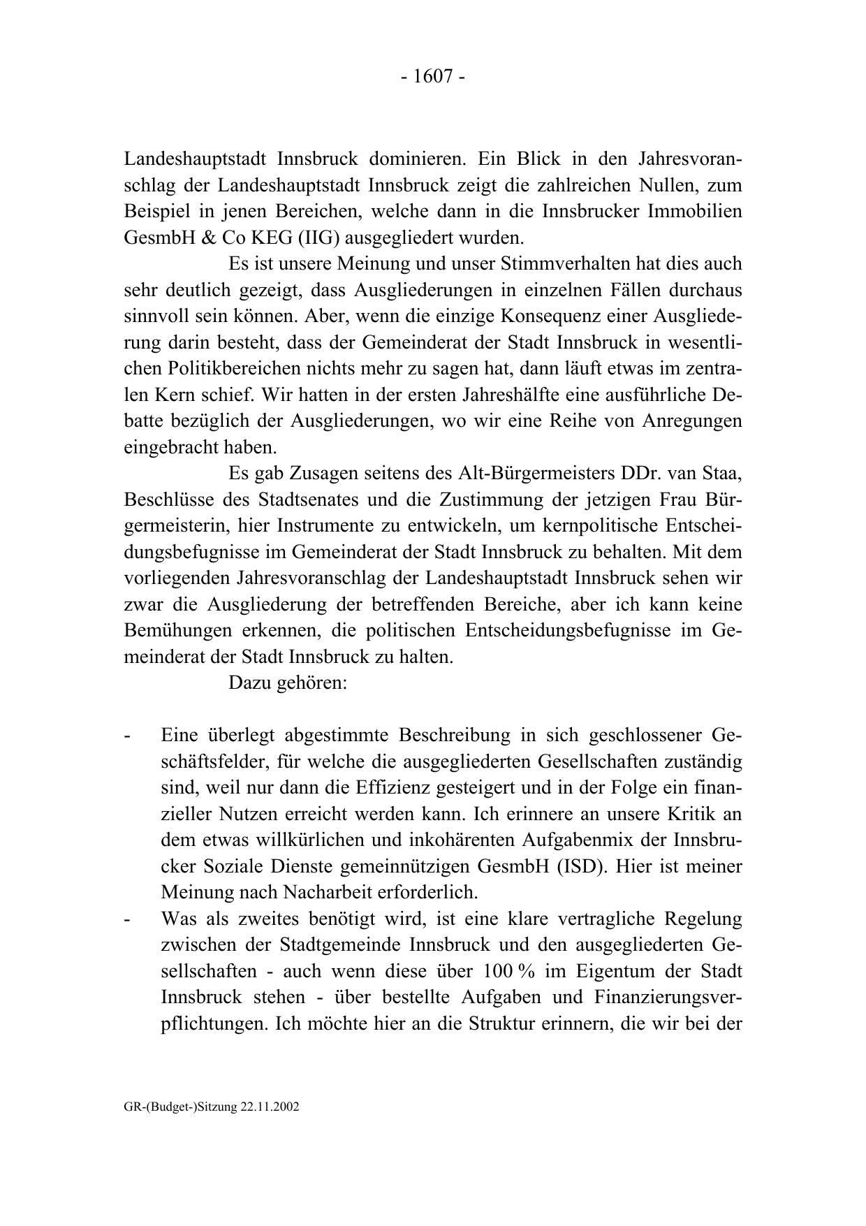 sinnvoll sein können. Aber, wenn die einzige Konsequenz einer Ausgliederung darin besteht, dass der Gemeinderat der Stadt Innsbruck in wesentlichen Politikbereichen nichts mehr zu sagen hat, dann läuft etwas im zentralen Kern schief. Wir hatten in der ersten Jahreshälfte eine ausführliche Debatte bezüglich der Ausgliederungen, wo wir eine Reihe von Anregungen