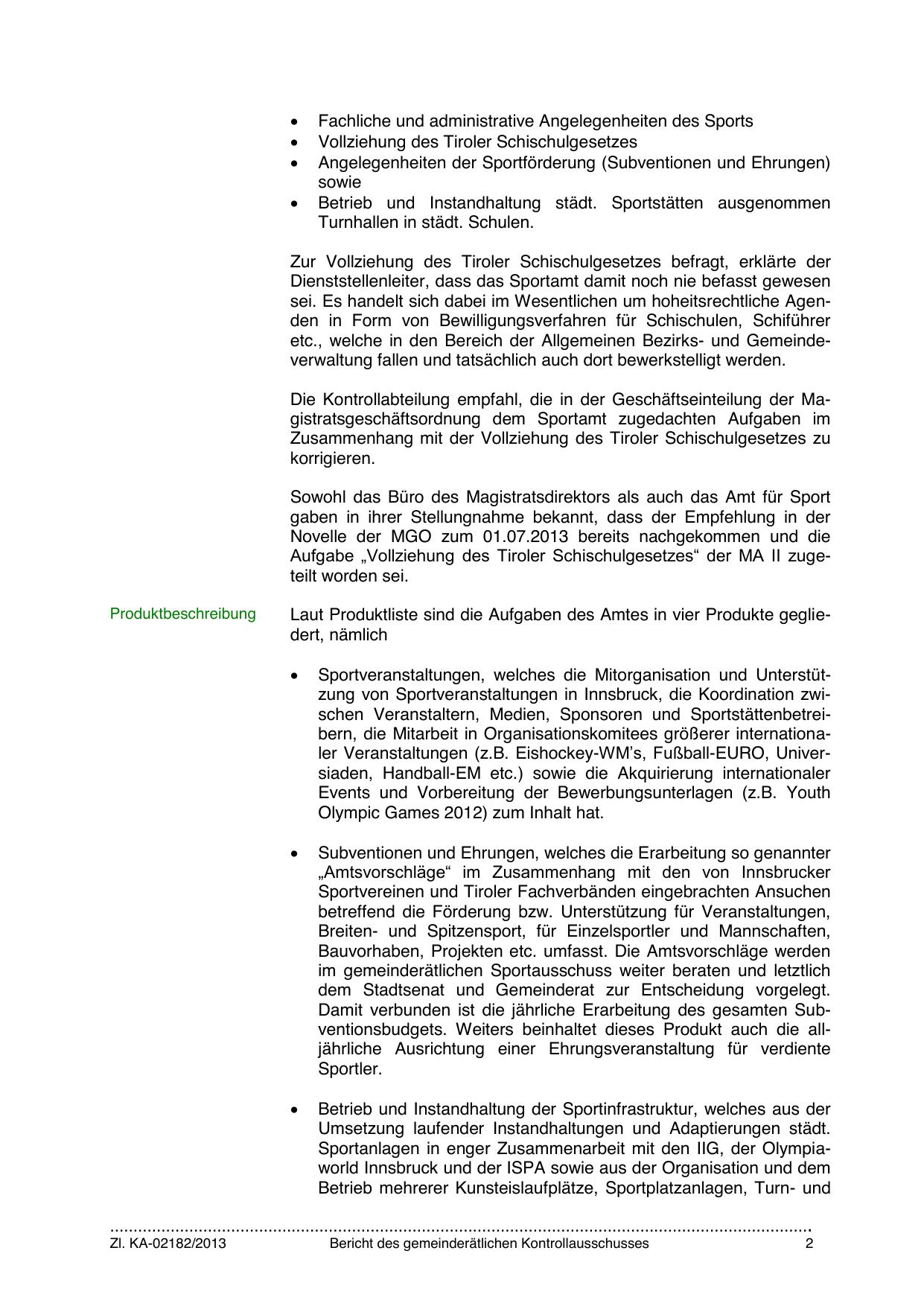 Die Kontrollabteilung empfahl, die in der Geschäftseinteilung der Magistratsgeschäftsordnung dem Sportamt zugedachten Aufgaben im