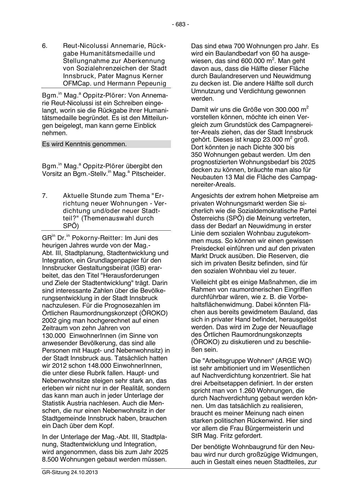 Bgm.in Mag.a Oppitz-Plörer: Von Annemarie Reut-Nicolussi ist ein Schreiben eingelangt, worin sie die Rückgabe ihrer Humanitätsmedaille begründet. Es ist den Mitteilungen beigelegt, man kann gerne Einblick