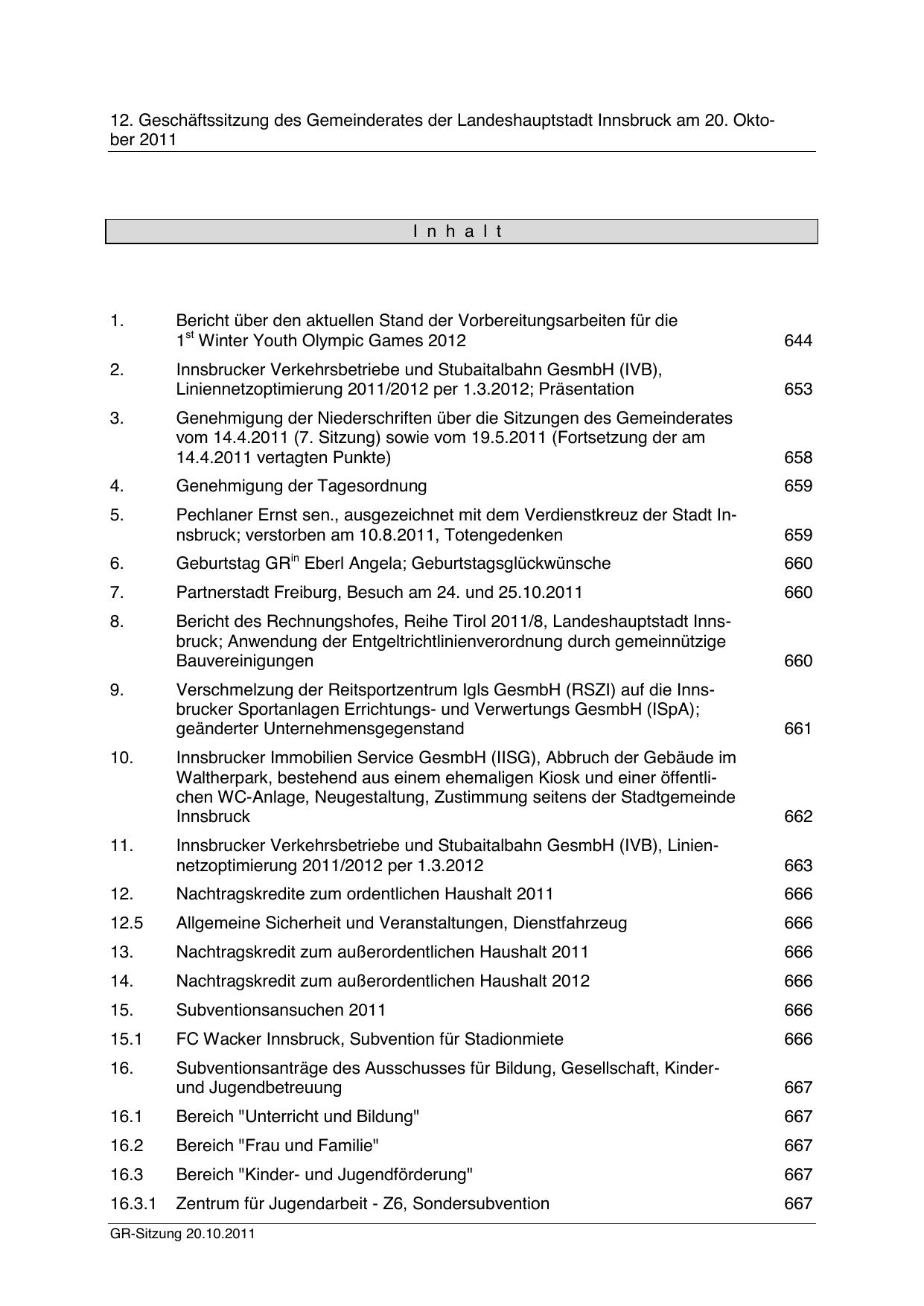 12. Geschäftssitzung des Gemeinderates der Landeshauptstadt Innsbruck am 20. Oktober 2011