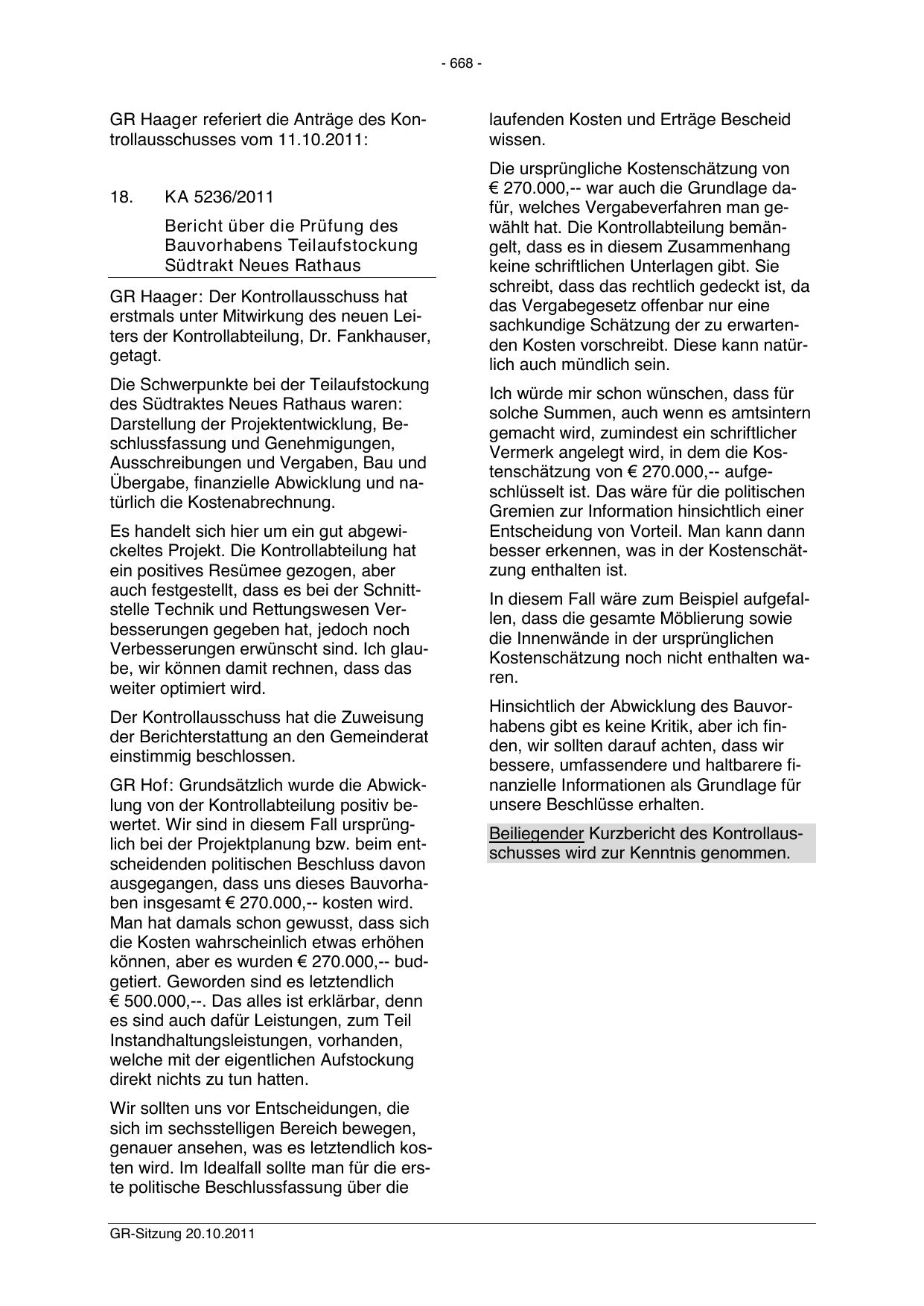 GR Haager referiert die Anträge des Kontrollausschusses vom 11.10.2011: