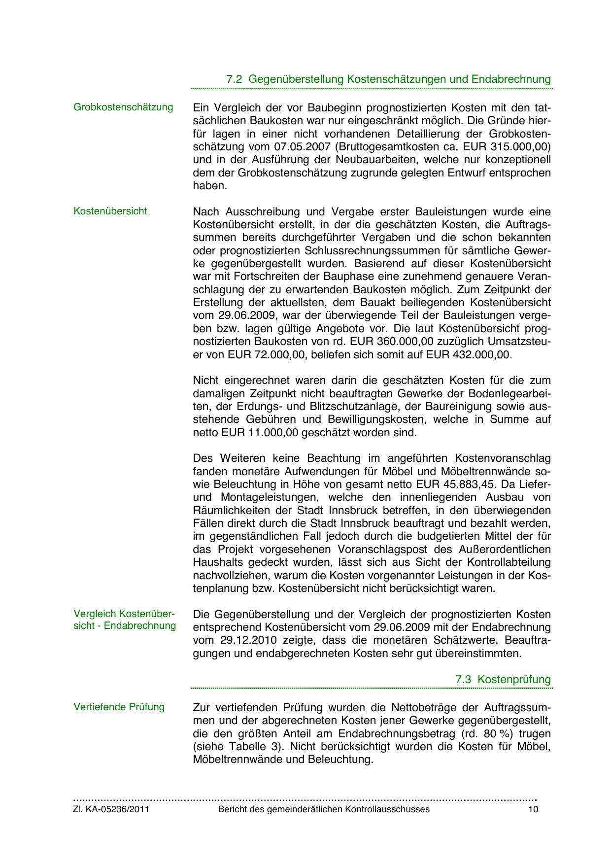 vom 29.12.2010 zeigte, dass die monetären Schätzwerte, Beauftragungen und endabgerechneten Kosten sehr gut übereinstimmten.