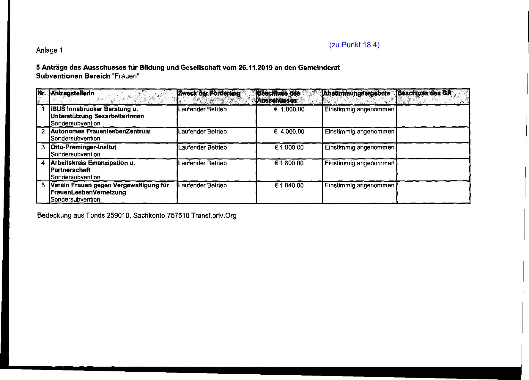 5 Anträge des Ausschusses für Bildung und Gesellschaft vom 26.11.2019 an den Gemeinderat