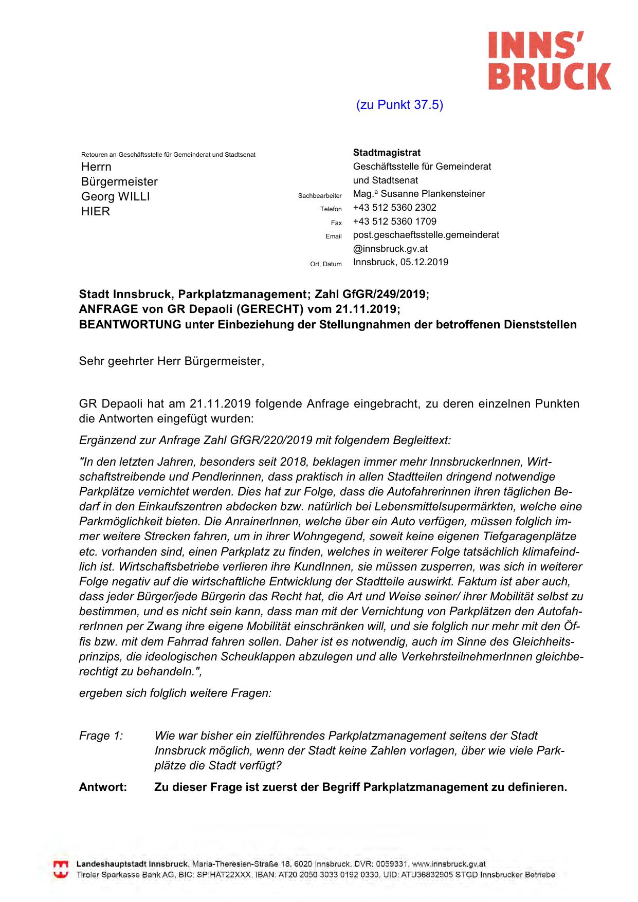 Stadt Innsbruck, Parkplatzmanagement; Zahl GfGR/249/2019;