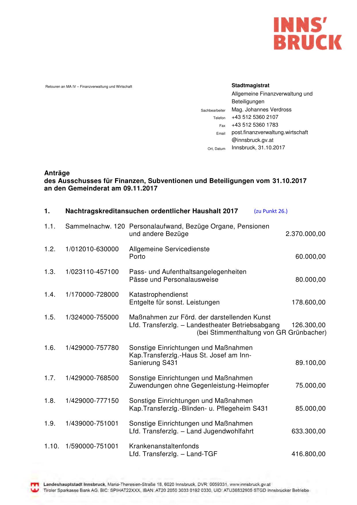 Nachtragskreditansuchen ordentlicher Haushalt 2017
