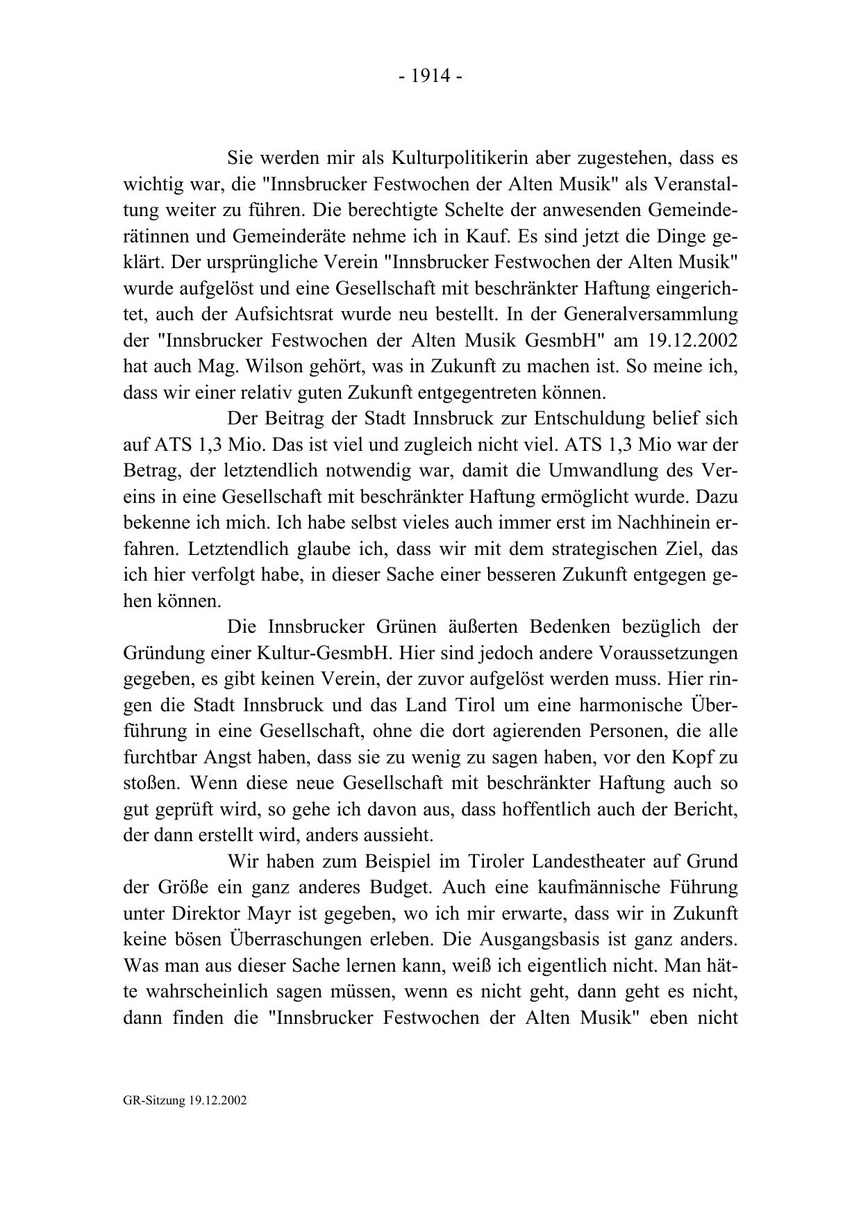 wichtig war, die "Innsbrucker Festwochen der Alten Musik" als Veranstaltung weiter zu führen. Die berechtigte Schelte der anwesenden Gemeinderätinnen und Gemeinderäte nehme ich in Kauf. Es sind jetzt die Dinge geklärt. Der ursprüngliche Verein "Innsbrucker Festwochen der Alten Musik"