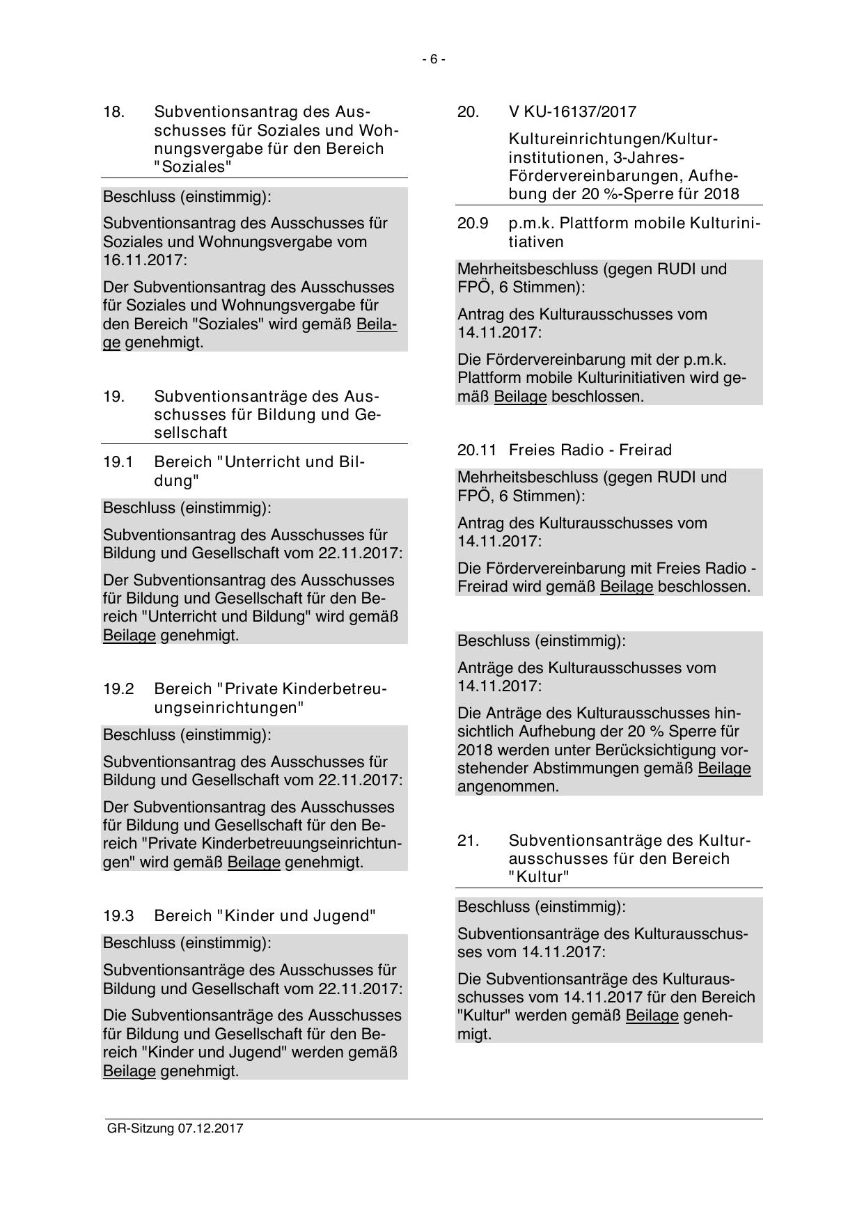 Die Subventionsanträge des Kulturausschusses vom 14.11.2017 für den Bereich