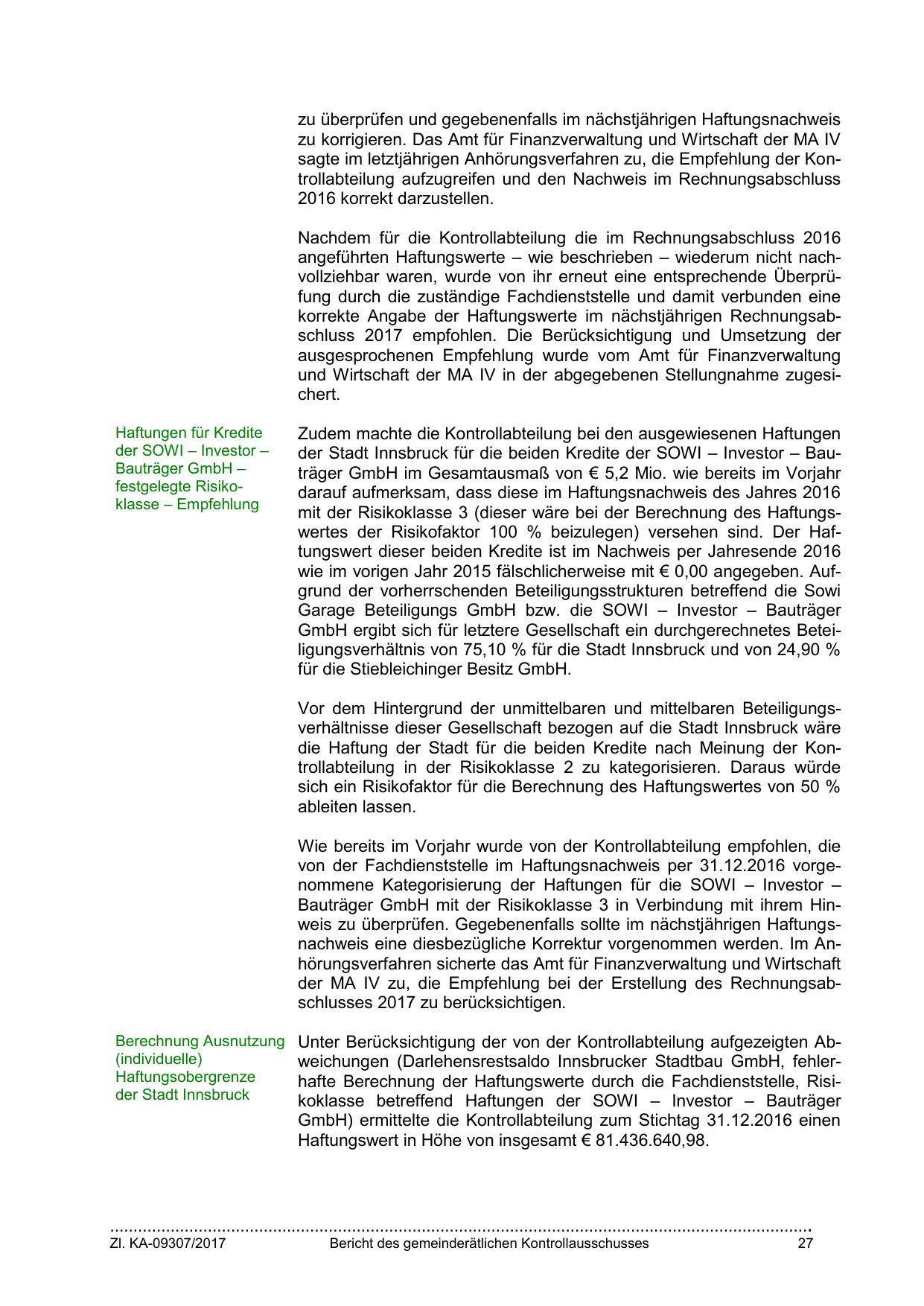Unter Berücksichtigung der von der Kontrollabteilung aufgezeigten Abweichungen (Darlehensrestsaldo Innsbrucker Stadtbau GmbH, fehlerhafte Berechnung der Haftungswerte durch die Fachdienststelle, Risikoklasse betreffend Haftungen der SOWI – Investor – Bauträger