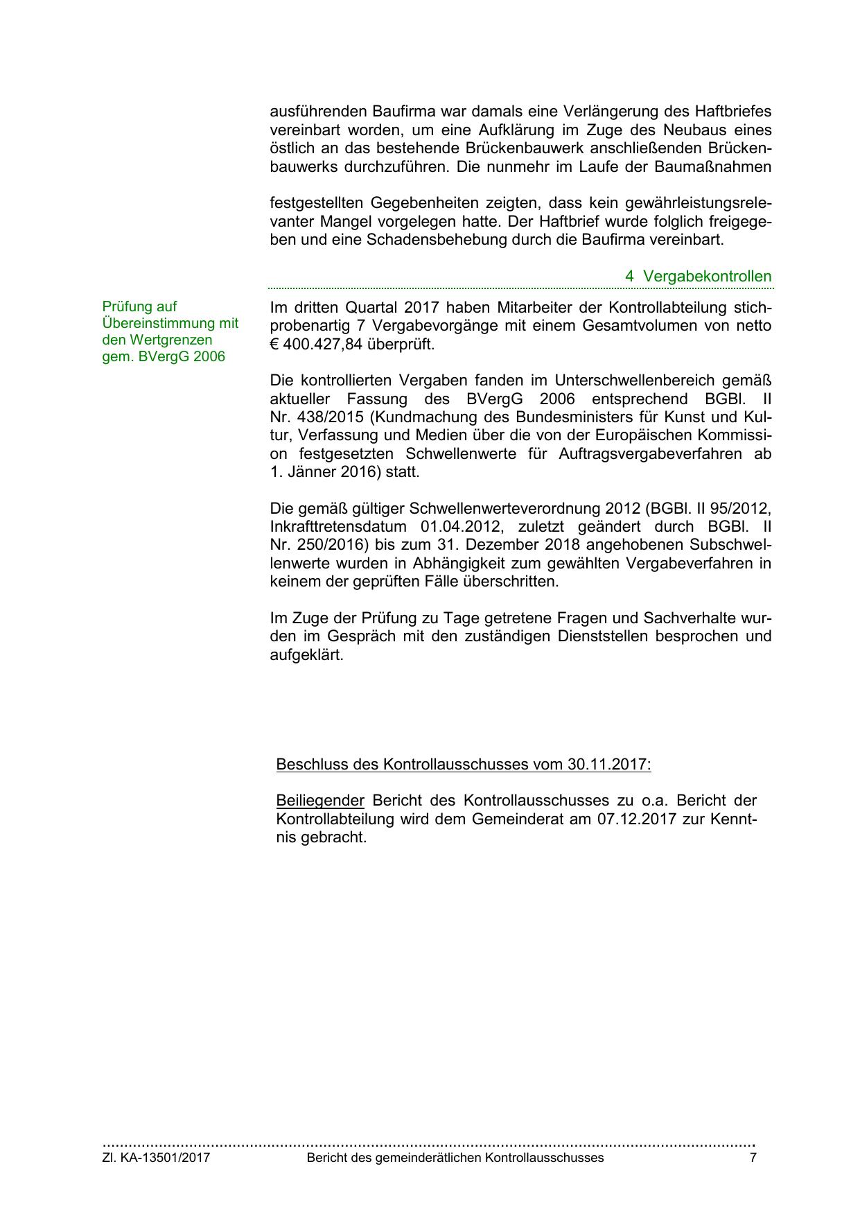 Im dritten Quartal 2017 haben Mitarbeiter der Kontrollabteilung stichprobenartig 7 Vergabevorgänge mit einem Gesamtvolumen von netto