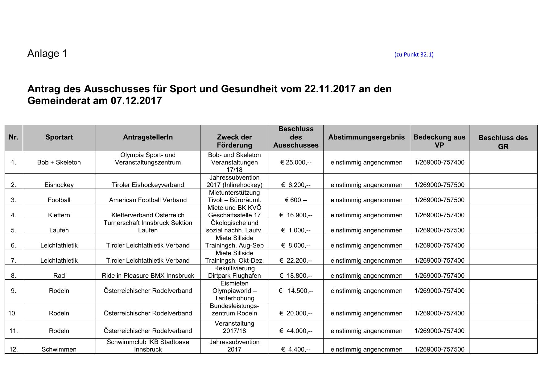 Antrag des Ausschusses für Sport und Gesundheit vom 22.11.2017 an den