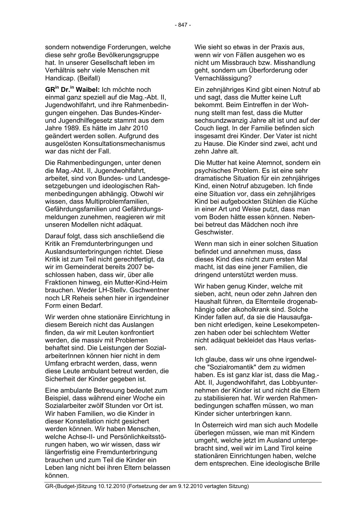GR-(Budget-)Sitzung 10.12.2010 (Fortsetzung der am 9.12.2010 vertagten Sitzung)
