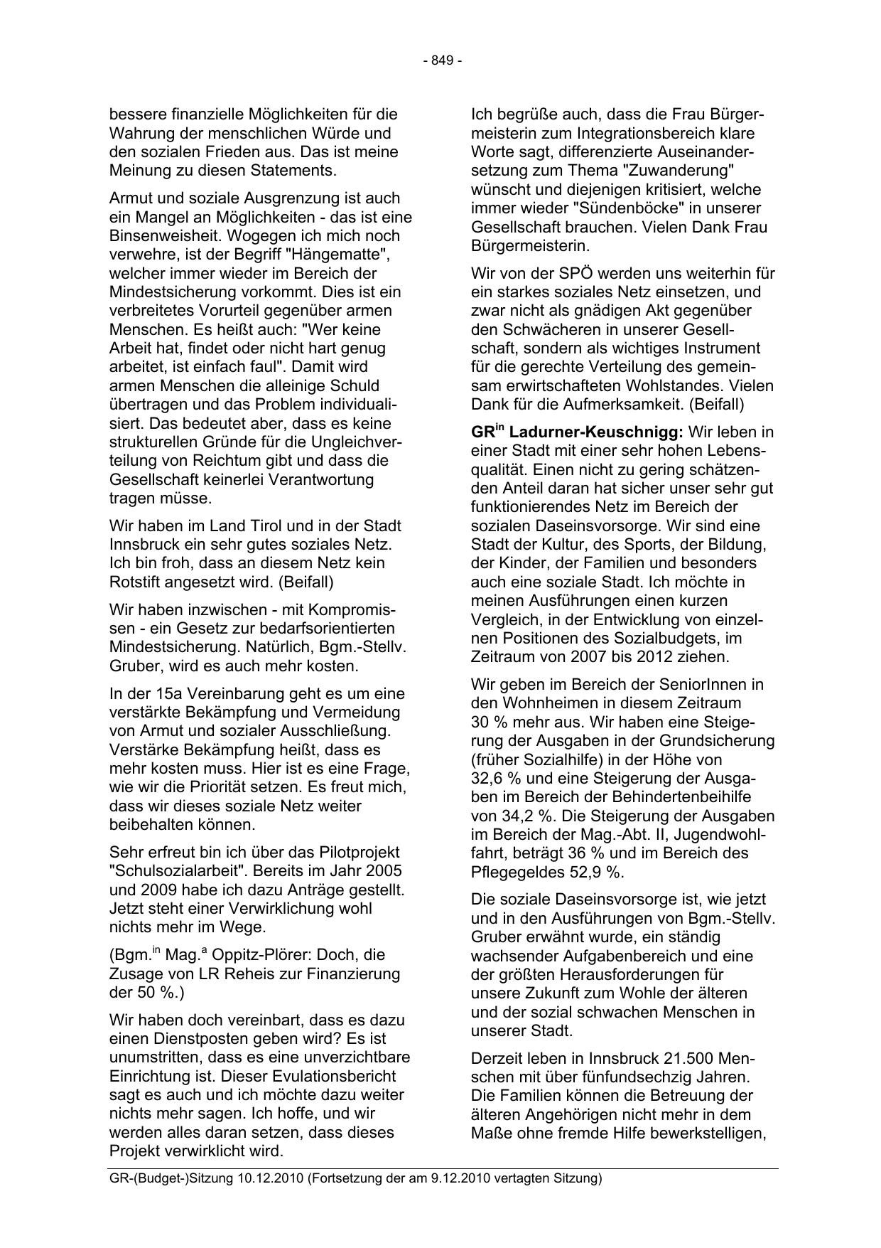 GR-(Budget-)Sitzung 10.12.2010 (Fortsetzung der am 9.12.2010 vertagten Sitzung)
