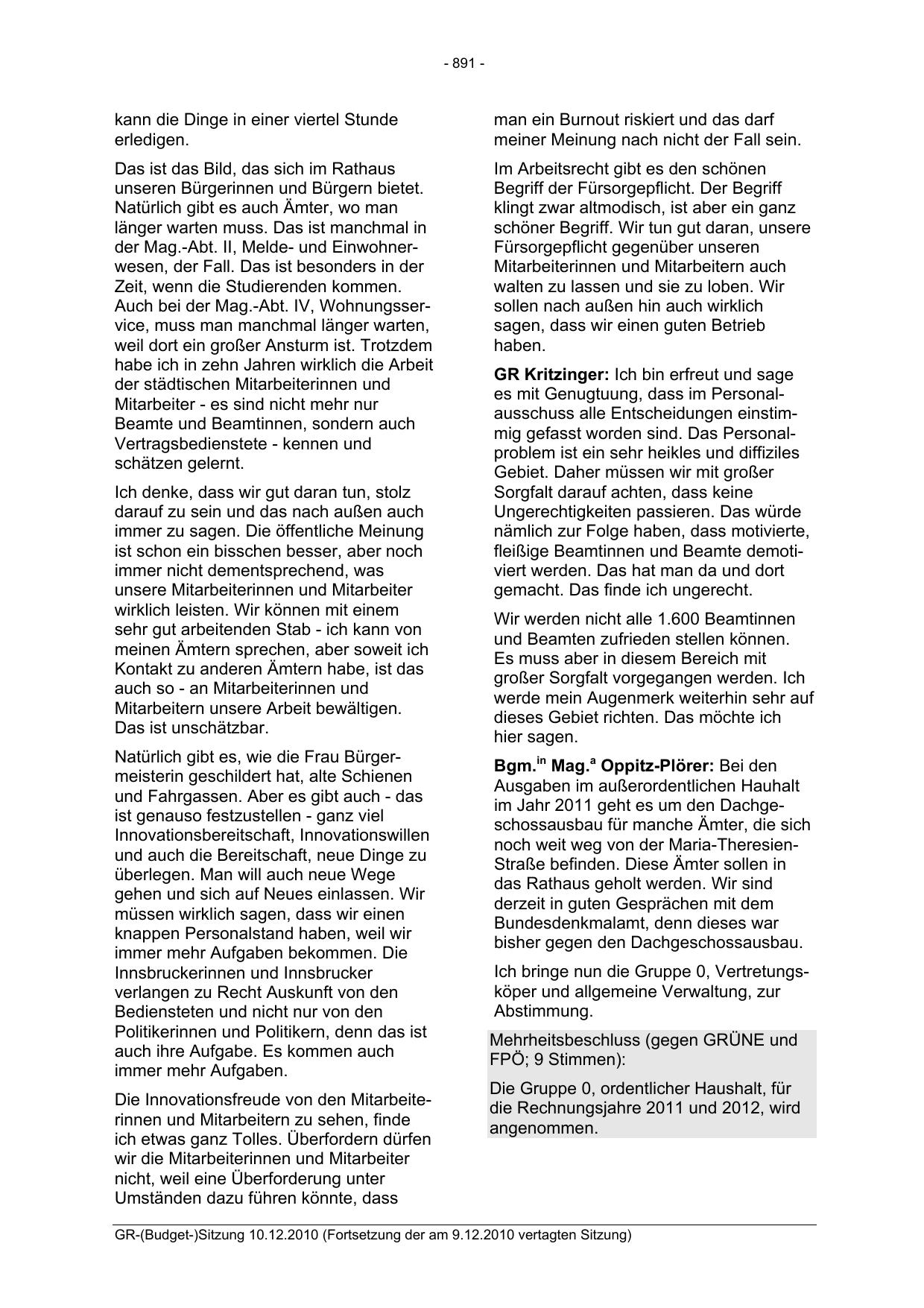 GR-(Budget-)Sitzung 10.12.2010 (Fortsetzung der am 9.12.2010 vertagten Sitzung)