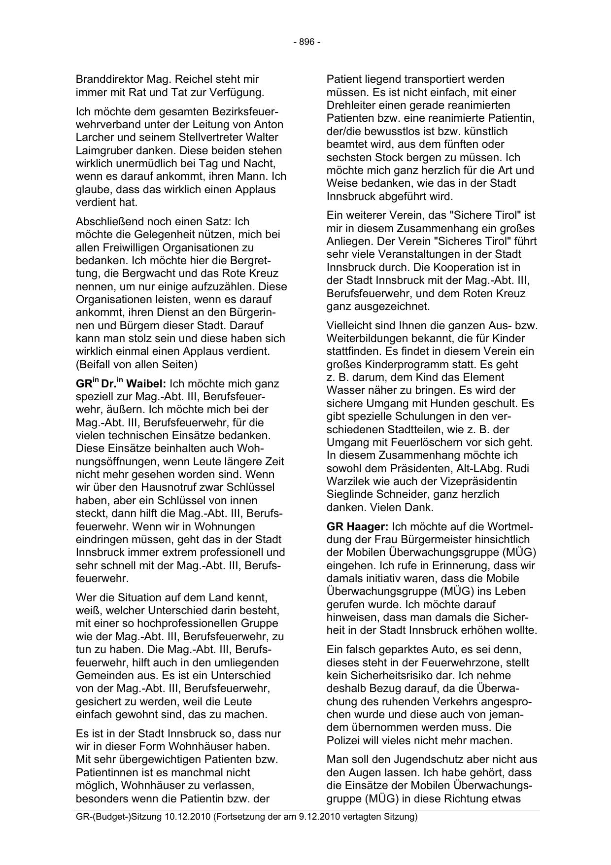 GR-(Budget-)Sitzung 10.12.2010 (Fortsetzung der am 9.12.2010 vertagten Sitzung)