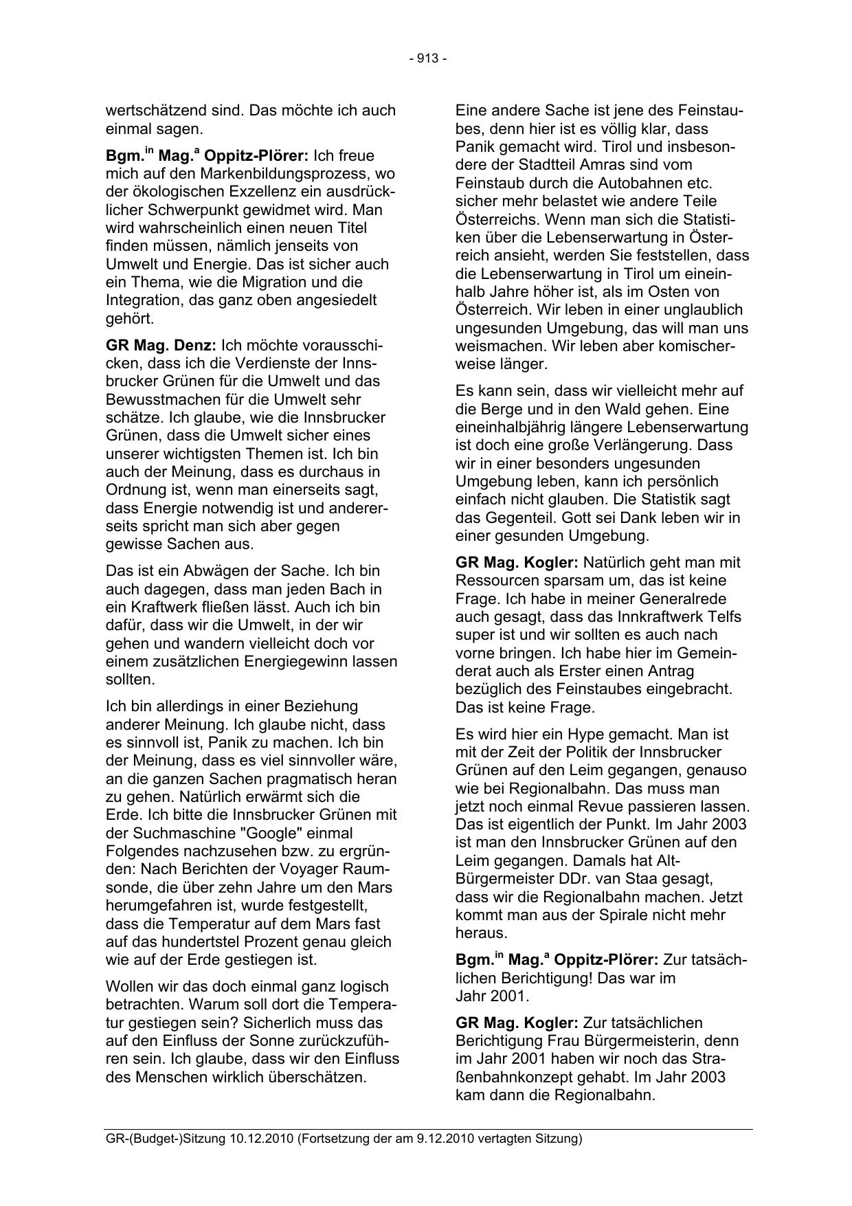 GR Mag. Denz: Ich möchte vorausschicken, dass ich die Verdienste der Innsbrucker Grünen für die Umwelt und das
