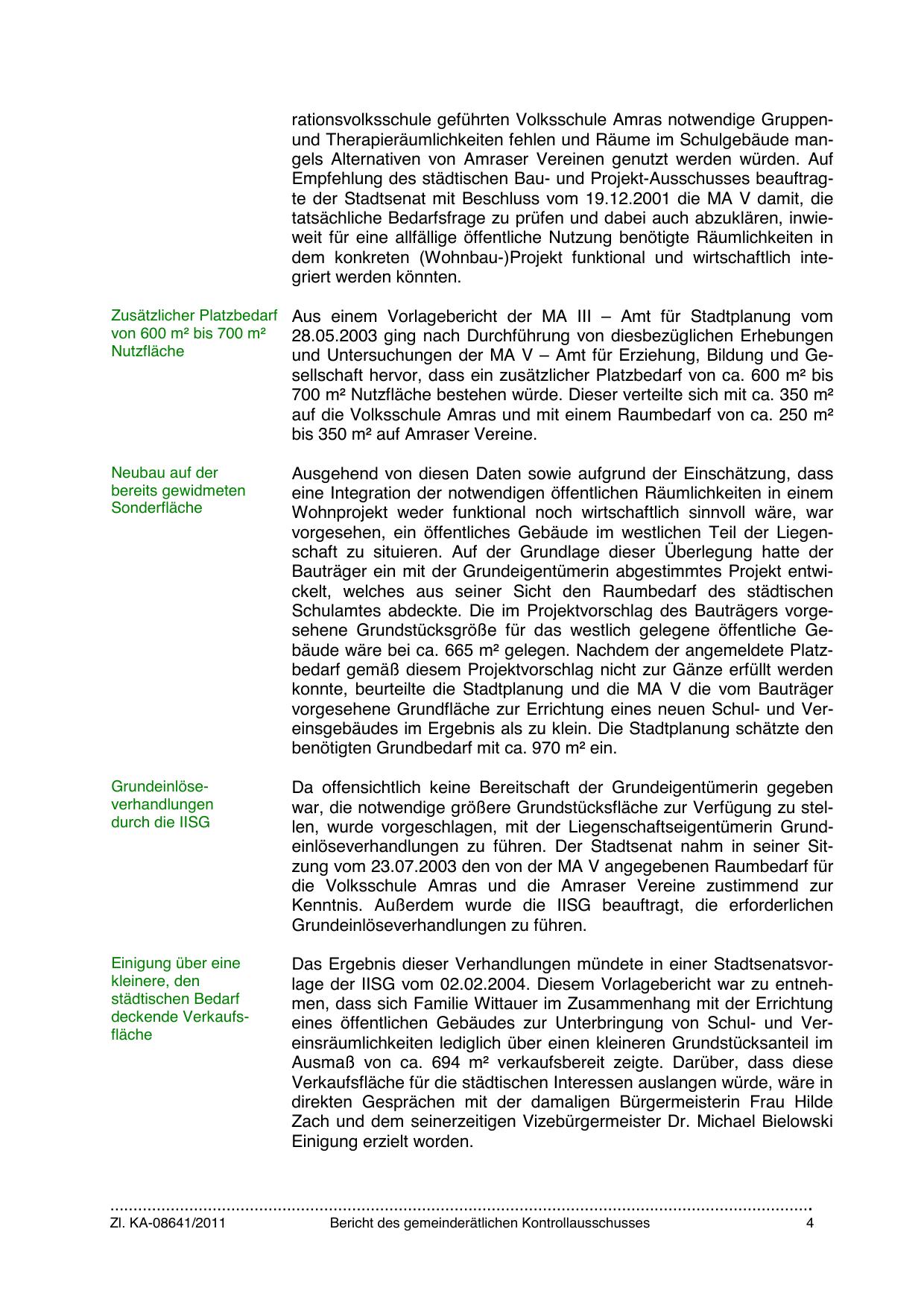 war, die notwendige größere Grundstücksfläche zur Verfügung zu stellen, wurde vorgeschlagen, mit der Liegenschaftseigentümerin Grundeinlöseverhandlungen zu führen. Der Stadtsenat nahm in seiner Sitzung vom 23.07.2003 den von der MA V angegebenen Raumbedarf für