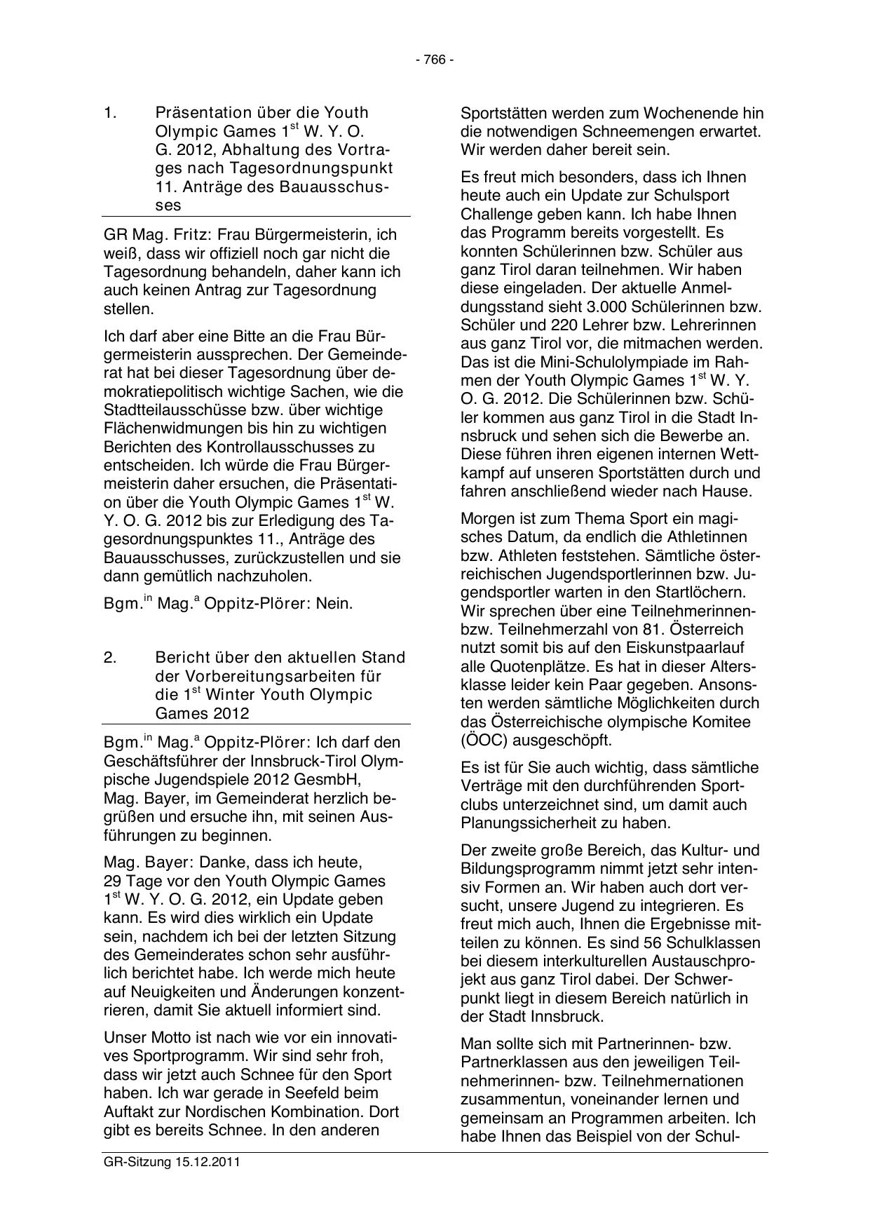 entscheiden. Ich würde die Frau Bürgermeisterin daher ersuchen, die Präsentation über die Youth Olympic Games 1st W.