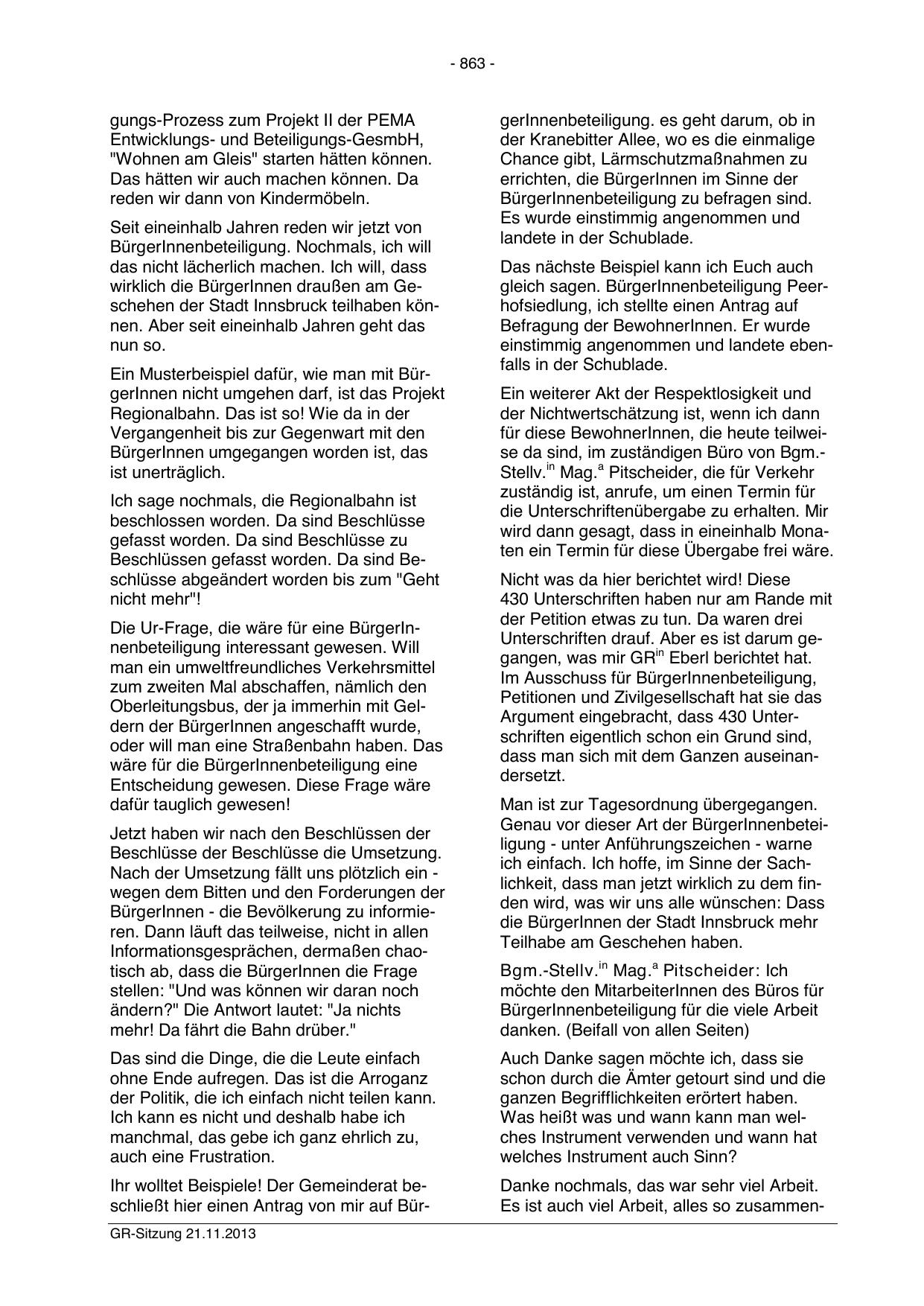 wirklich die BürgerInnen draußen am Geschehen der Stadt Innsbruck teilhaben können. Aber seit eineinhalb Jahren geht das