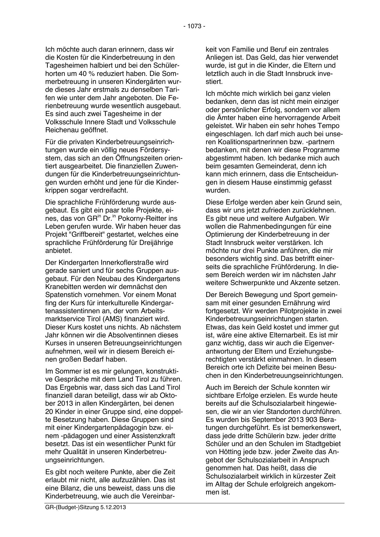 Kinderbetreuung, wie auch die VereinbarGR-(Budget-)Sitzung 5.12.2013