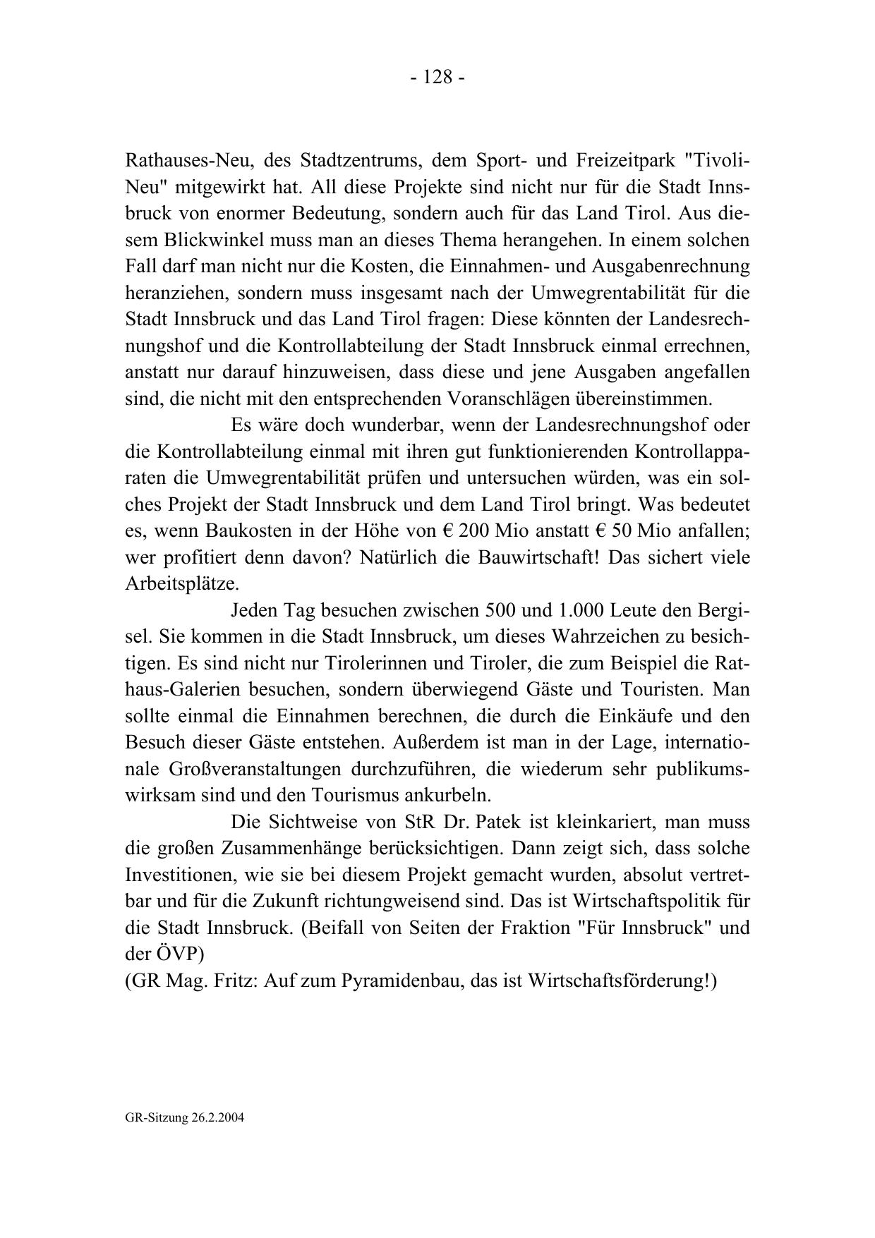 die Kontrollabteilung einmal mit ihren gut funktionierenden Kontrollapparaten die Umwegrentabilität prüfen und untersuchen würden, was ein solches Projekt der Stadt Innsbruck und dem Land Tirol bringt. Was bedeutet