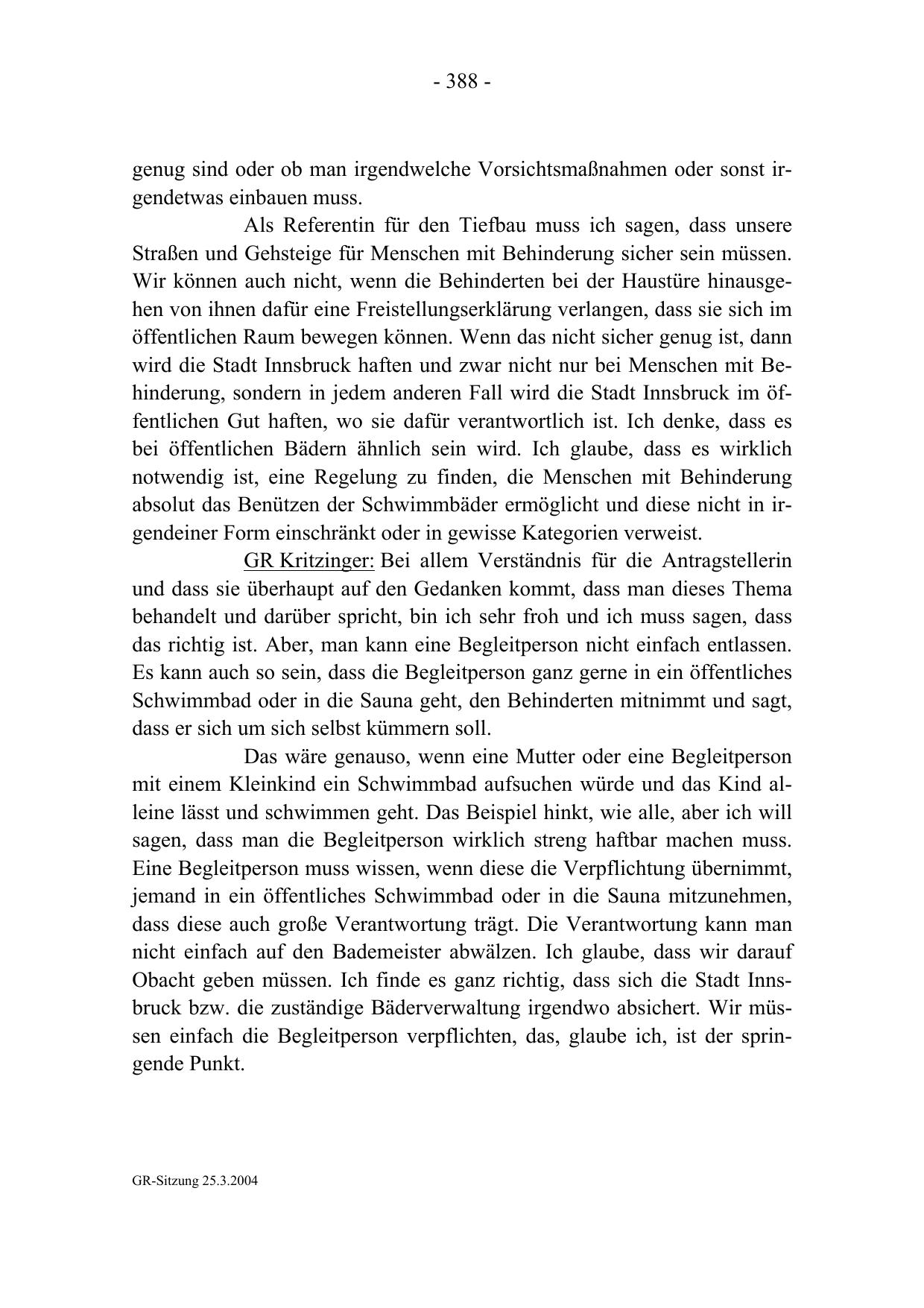 wird die Stadt Innsbruck haften und zwar nicht nur bei Menschen mit Behinderung, sondern in jedem anderen Fall wird die Stadt Innsbruck im öffentlichen Gut haften, wo sie dafür verantwortlich ist. Ich denke, dass es