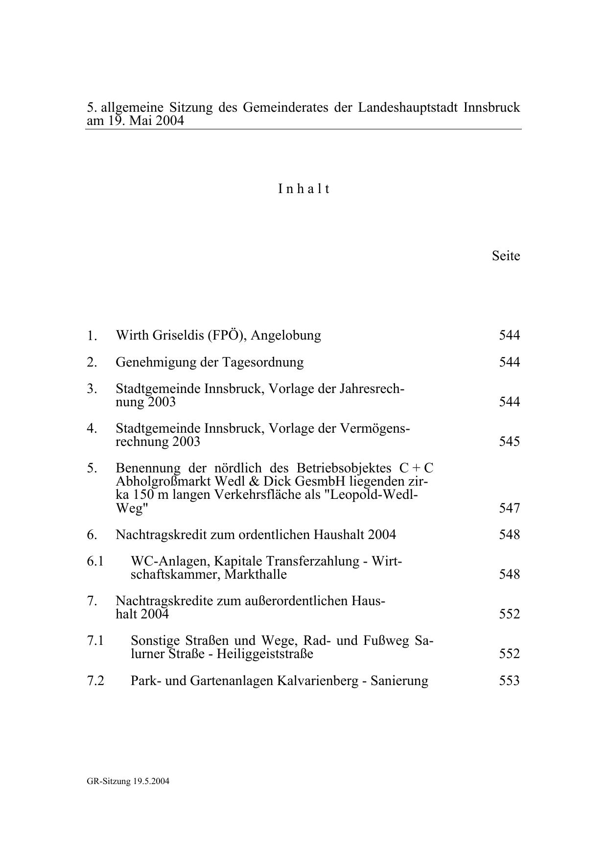 Stadtgemeinde Innsbruck, Vorlage der Jahresrechnung 2003