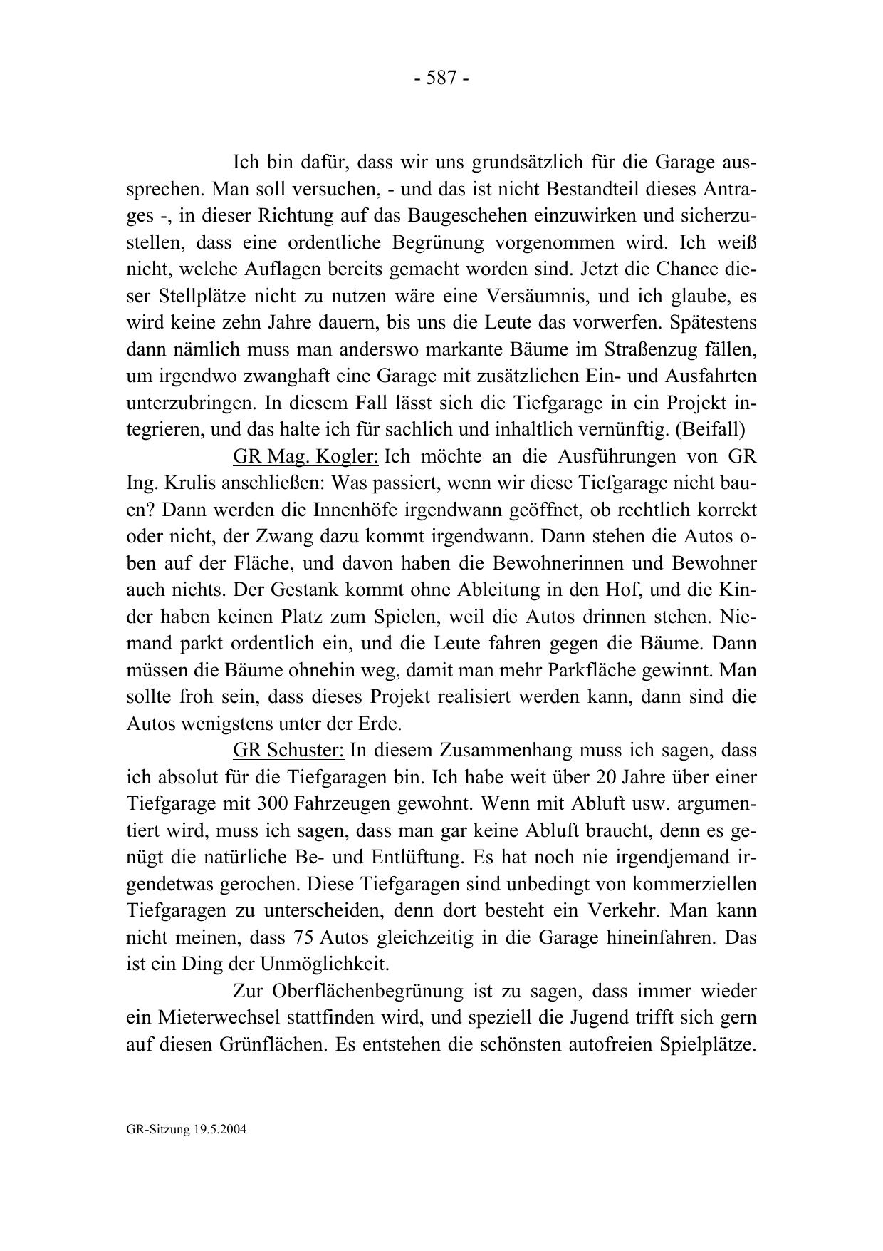 Ich bin dafür, dass wir uns grundsätzlich für die Garage aussprechen. Man soll versuchen, - und das ist nicht Bestandteil dieses Antrages -, in dieser Richtung auf das Baugeschehen einzuwirken und sicherzustellen, dass eine ordentliche Begrünung vorgenommen wird. Ich weiß