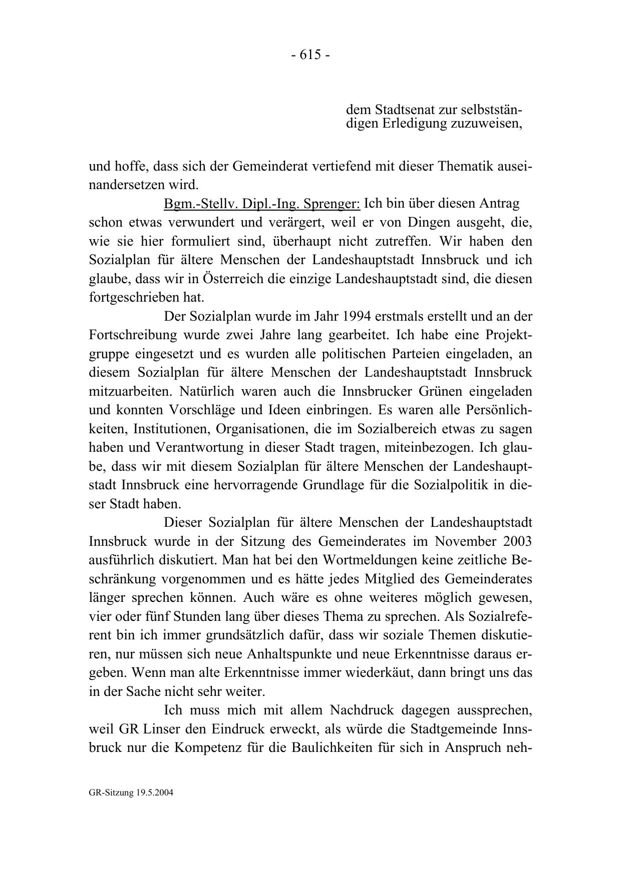 weil GR Linser den Eindruck erweckt, als würde die Stadtgemeinde Innsbruck nur die Kompetenz für die Baulichkeiten für sich in Anspruch nehGR-Sitzung 19.5.2004