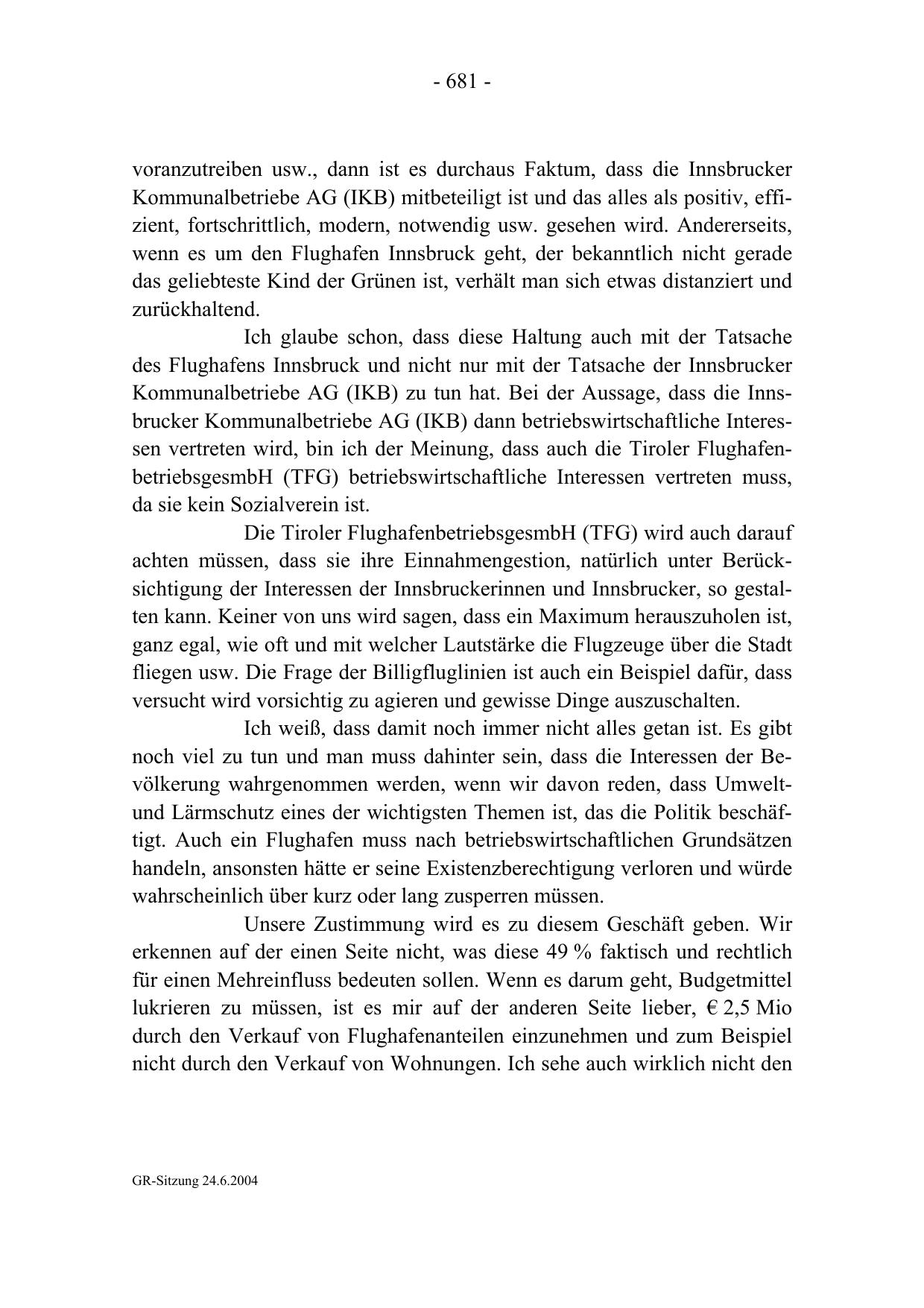 Kommunalbetriebe AG (IKB) zu tun hat. Bei der Aussage, dass die Innsbrucker Kommunalbetriebe AG (IKB) dann betriebswirtschaftliche Interessen vertreten wird, bin ich der Meinung, dass auch die Tiroler FlughafenbetriebsgesmbH (TFG) betriebswirtschaftliche Interessen vertreten muss,