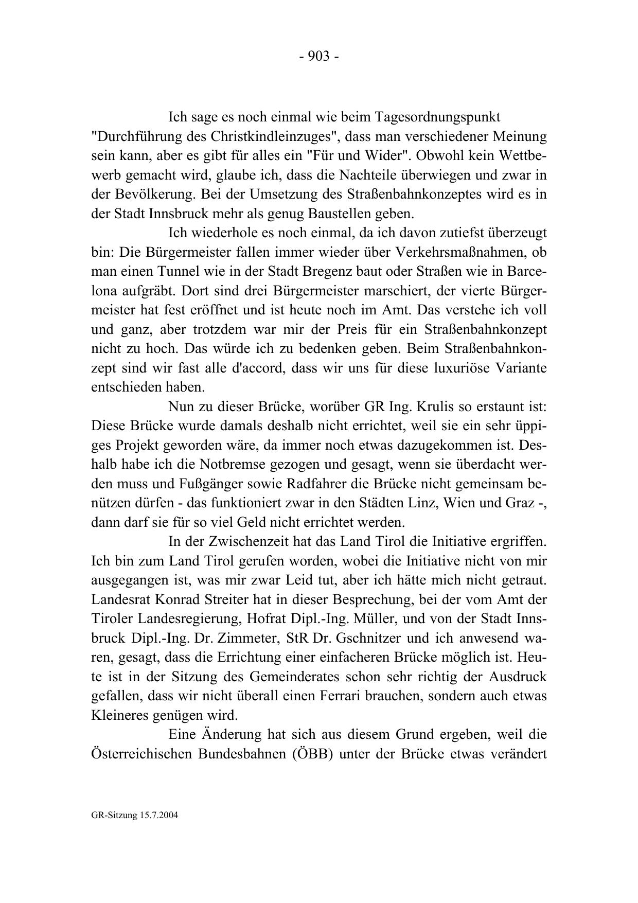 Tiroler Landesregierung, Hofrat Dipl.-Ing. Müller, und von der Stadt Innsbruck Dipl.-Ing. Dr. Zimmeter, StR Dr. Gschnitzer und ich anwesend waren, gesagt, dass die Errichtung einer einfacheren Brücke möglich ist. Heute ist in der Sitzung des Gemeinderates schon sehr richtig der Ausdruck