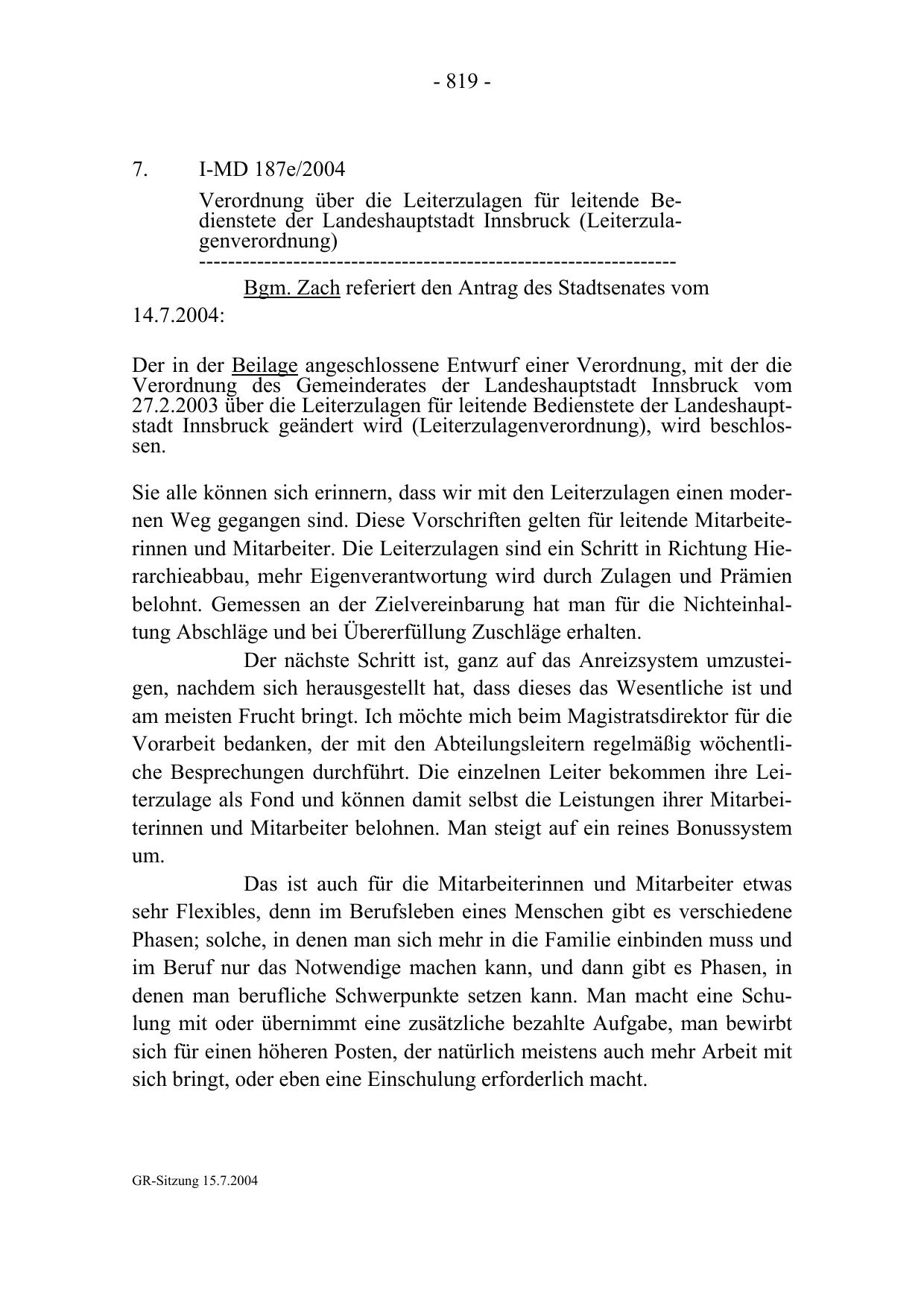 27.2.2003 über die Leiterzulagen für leitende Bedienstete der Landeshauptstadt Innsbruck geändert wird (Leiterzulagenverordnung), wird beschlossen.