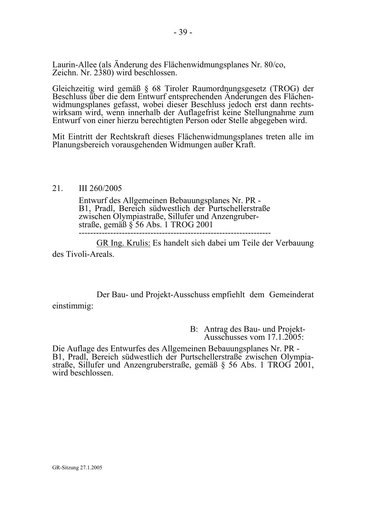 Die Auflage des Entwurfes des Allgemeinen Bebauungsplanes Nr. PR B1, Pradl, Bereich südwestlich der Purtschellerstraße zwischen Olympiastraße, Sillufer und Anzengruberstraße, gemäß § 56 Abs. 1 TROG 2001,