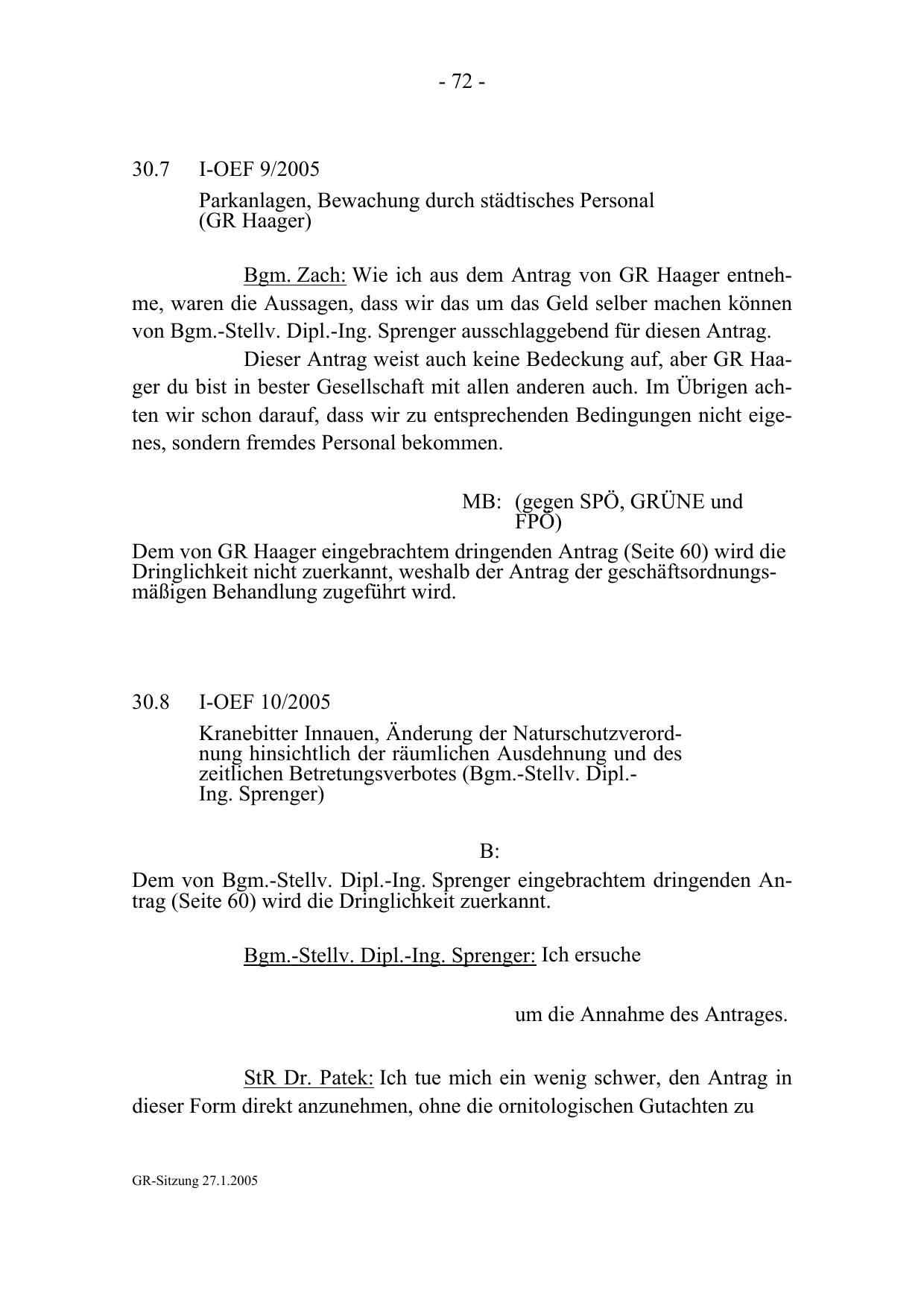 Dem von GR Haager eingebrachtem dringenden Antrag (Seite 60) wird die