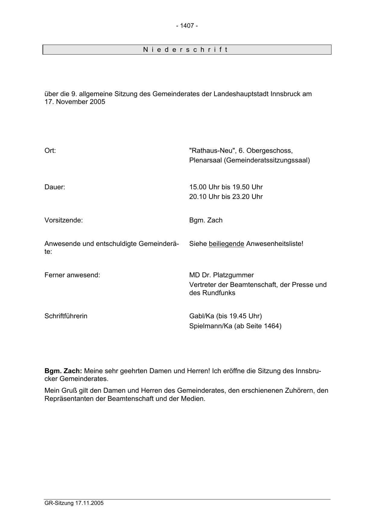 Bgm. Zach: Meine sehr geehrten Damen und Herren! Ich eröffne die Sitzung des Innsbrucker Gemeinderates.