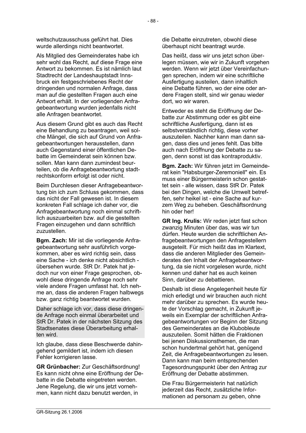 eine Sache - ich denke nicht absichtlich übersehen wurde. StR Dr. Patek hat jedoch nur von einer Frage gesprochen, obwohl diese dringende Anfrage noch sehr