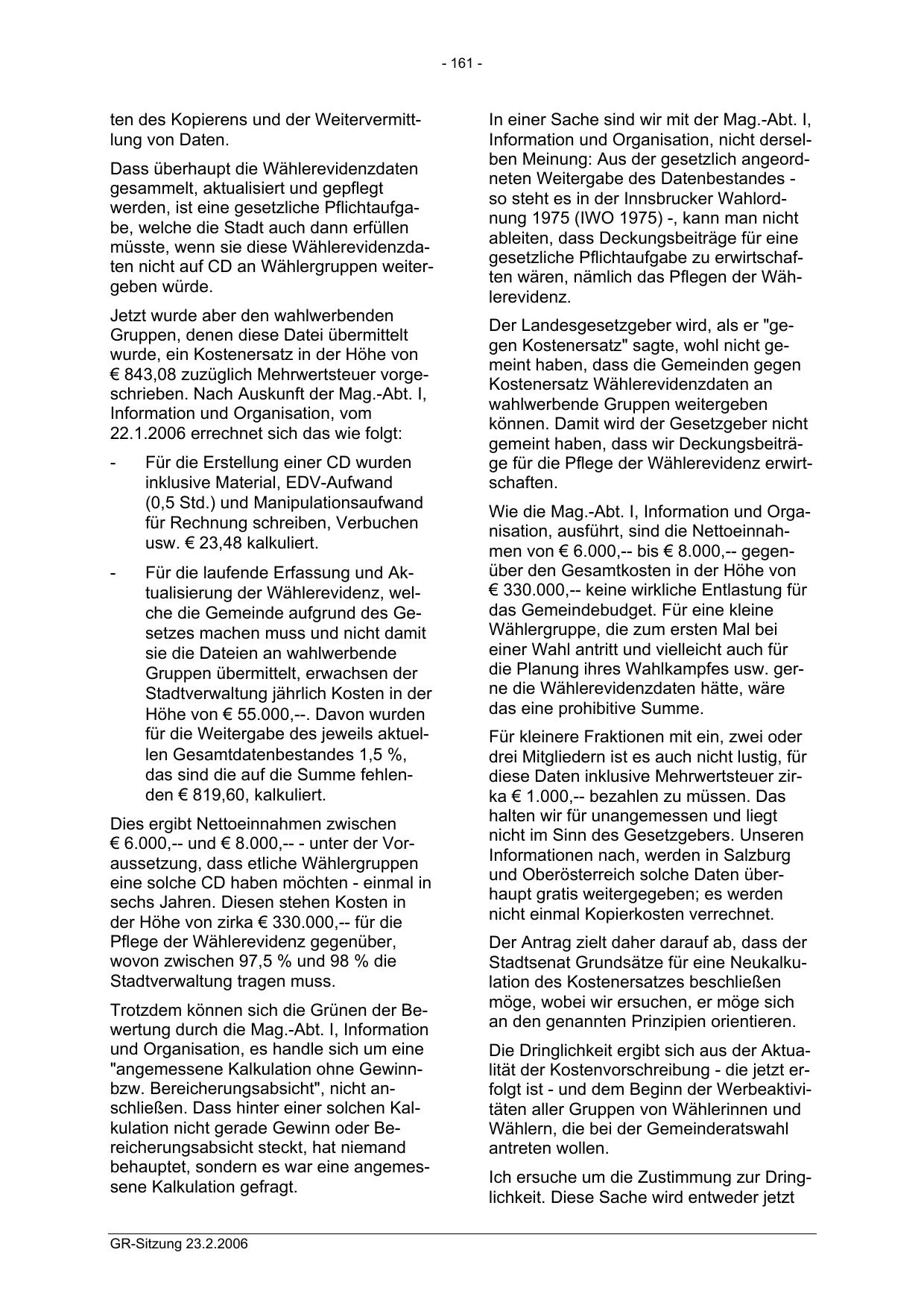 Die Dringlichkeit ergibt sich aus der Aktualität der Kostenvorschreibung - die jetzt erfolgt ist - und dem Beginn der Werbeaktivitäten aller Gruppen von Wählerinnen und