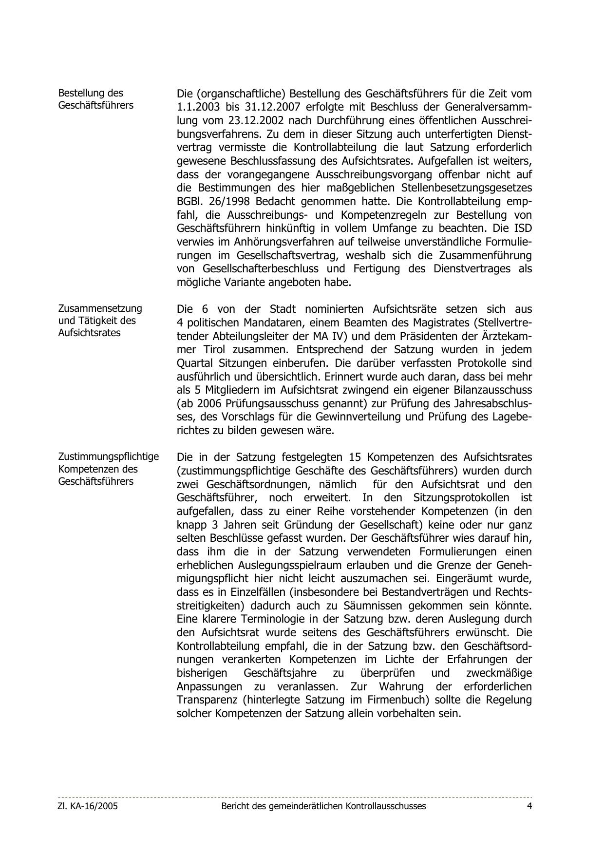 1.1.2003 bis 31.12.2007 erfolgte mit Beschluss der Generalversammlung vom 23.12.2002 nach Durchführung eines öffentlichen Ausschreibungsverfahrens. Zu dem in dieser Sitzung auch unterfertigten Dienstvertrag vermisste die Kontrollabteilung die laut Satzung erforderlich