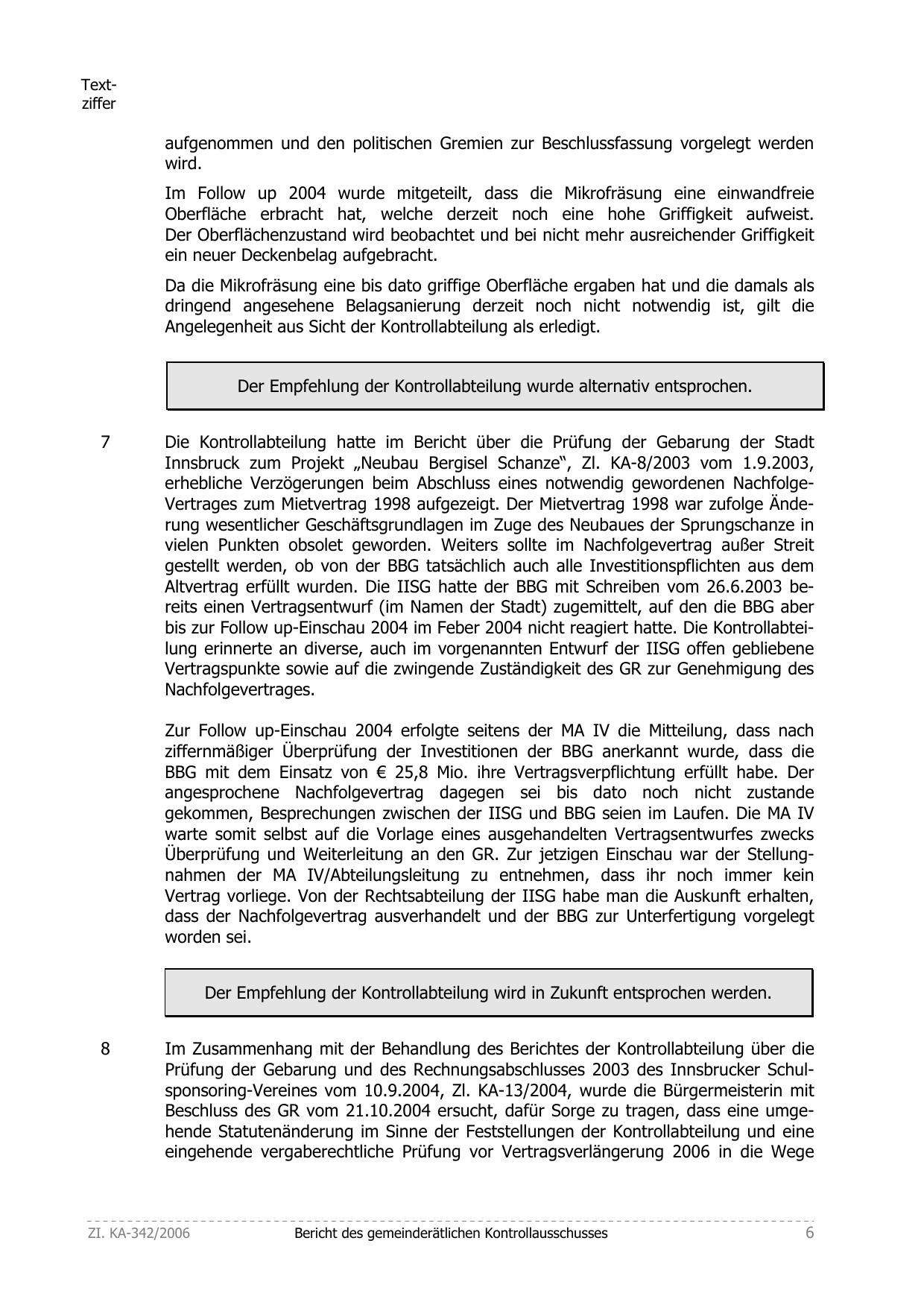 Innsbruck zum Projekt „Neubau Bergisel Schanze“, Zl. KA-8/2003 vom 1.9.2003,