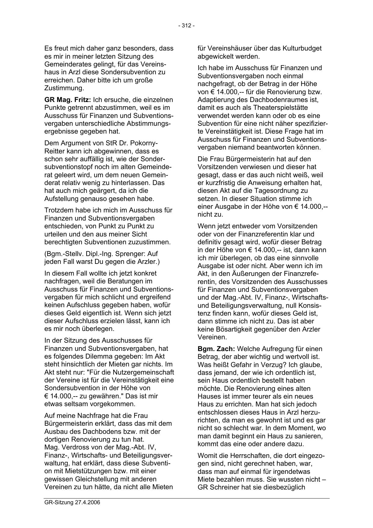 schon sehr auffällig ist, wie der Sondersubventionstopf noch im alten Gemeinderat geleert wird, um dem neuen Gemeinderat relativ wenig zu hinterlassen. Das