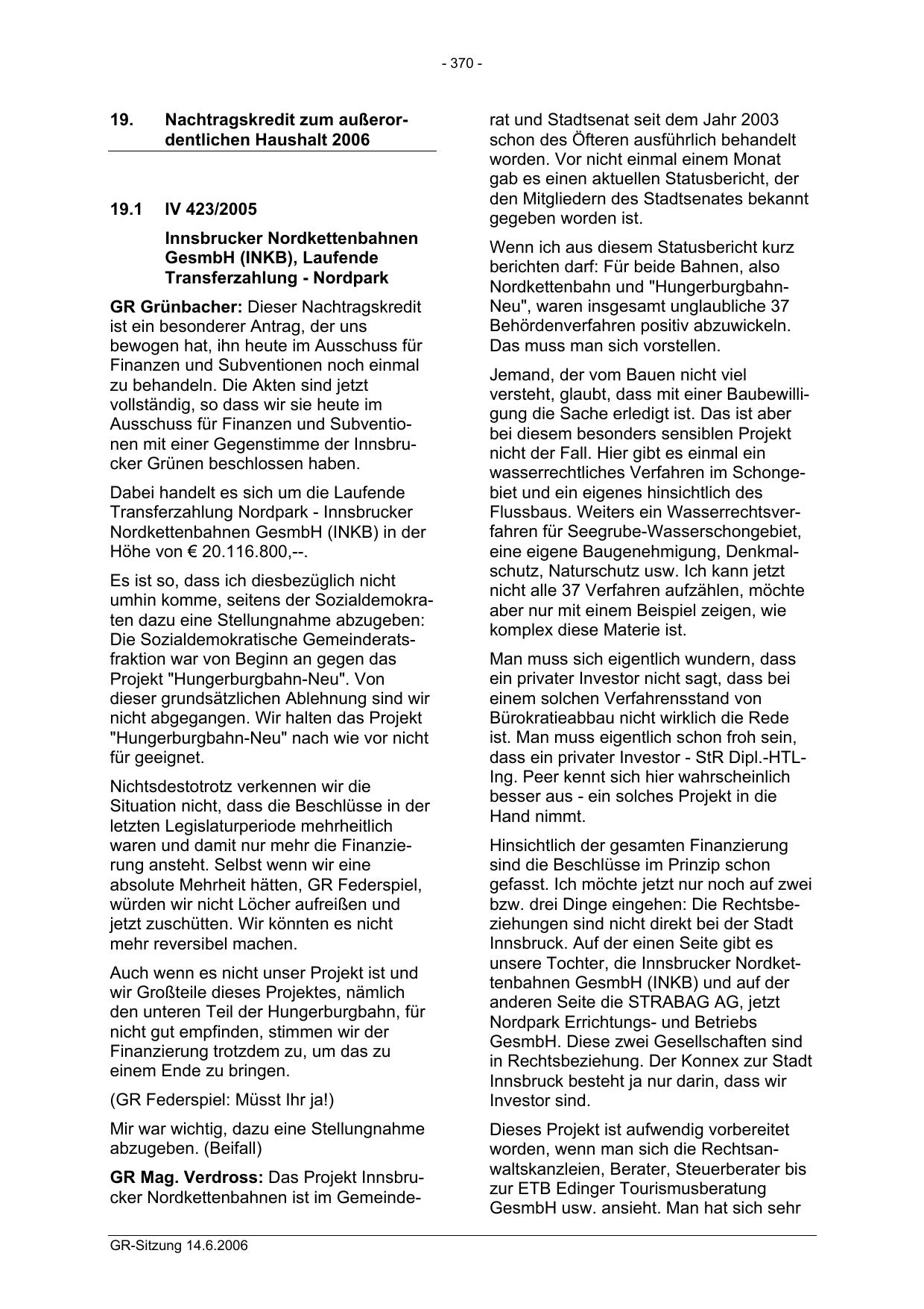 GR Mag. Verdross: Das Projekt Innsbrucker Nordkettenbahnen ist im GemeindeGR-Sitzung 14.6.2006