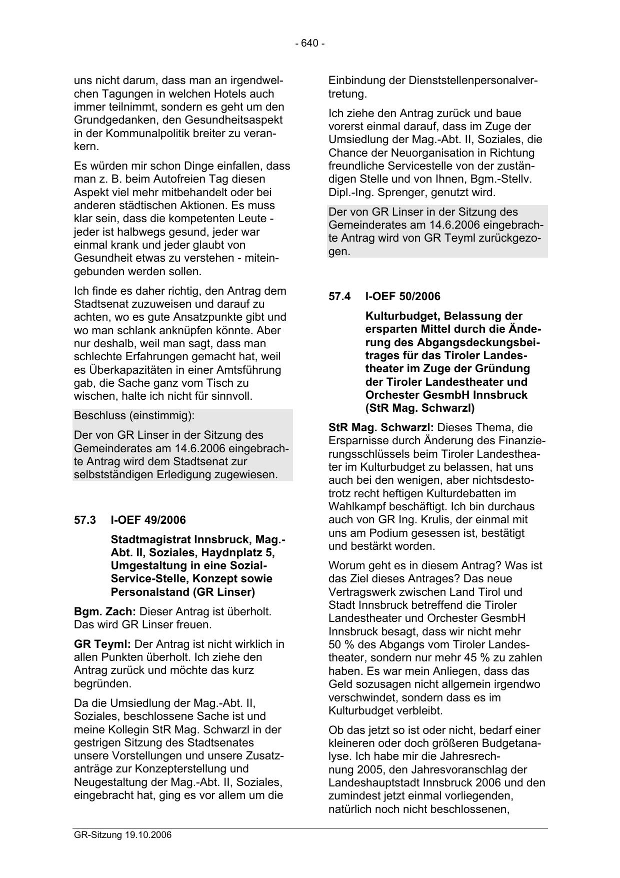 Gemeinderates am 14.6.2006 eingebrachte Antrag wird von GR Teyml zurückgezogen.