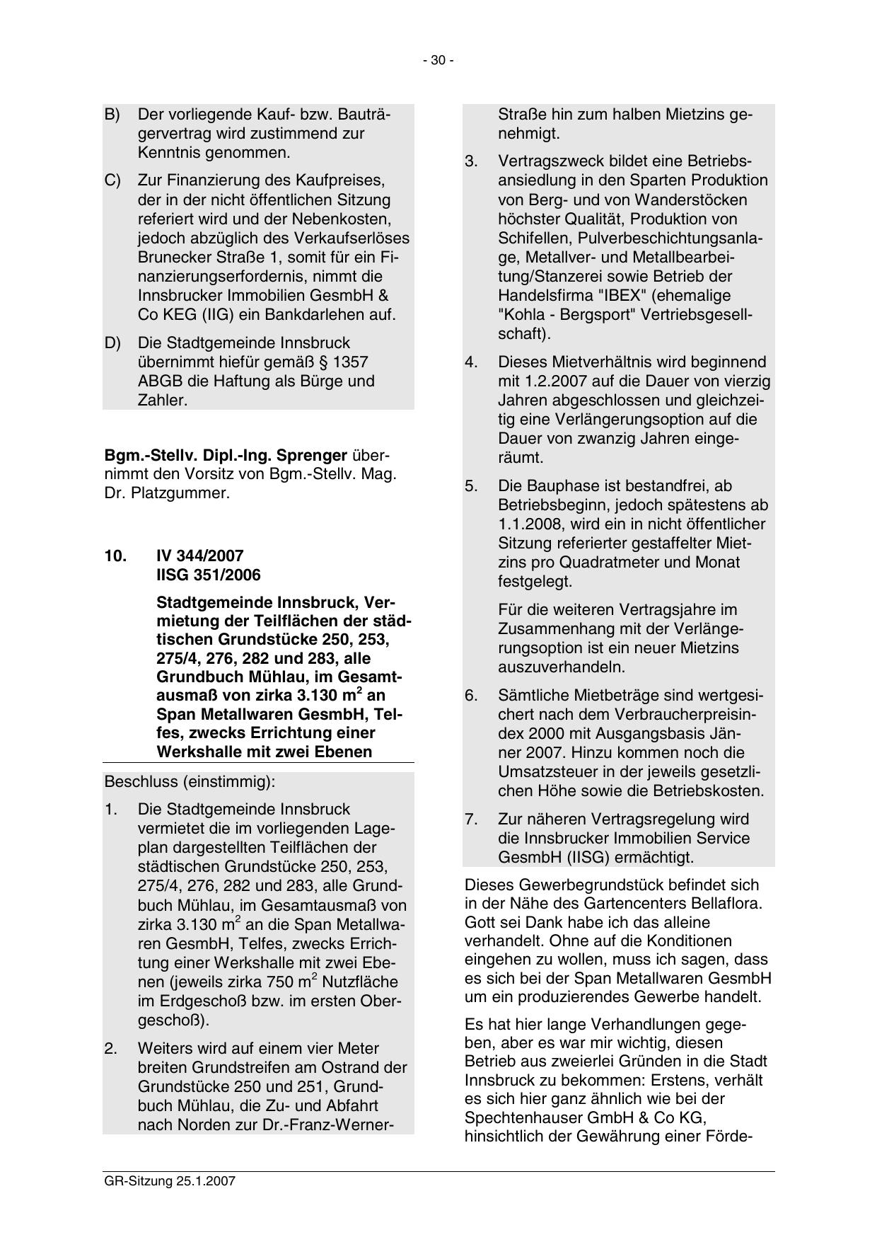 Stadtgemeinde Innsbruck, Vermietung der Teilflächen der städtischen Grundstücke 250, 253,