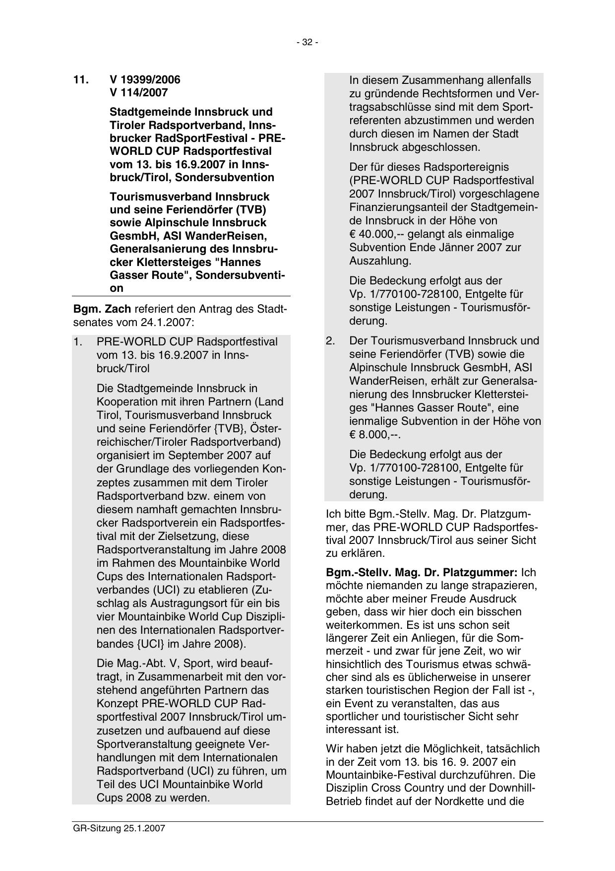 Ich bitte Bgm.-Stellv. Mag. Dr. Platzgummer, das PRE-WORLD CUP Radsportfestival 2007 Innsbruck/Tirol aus seiner Sicht
