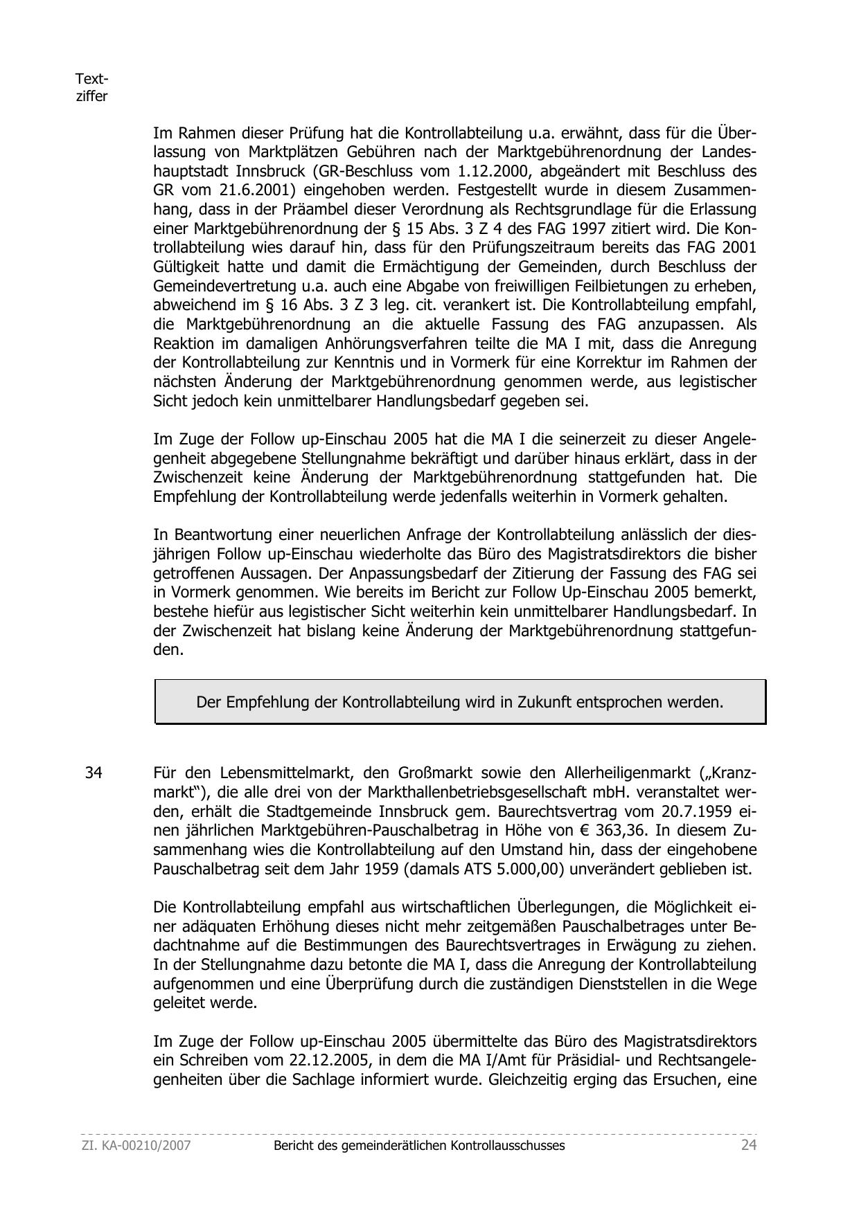 Im Rahmen dieser Prüfung hat die Kontrollabteilung u.a. erwähnt, dass für die Überlassung von Marktplätzen Gebühren nach der Marktgebührenordnung der Landeshauptstadt Innsbruck (GR-Beschluss vom 1.12.2000, abgeändert mit Beschluss des