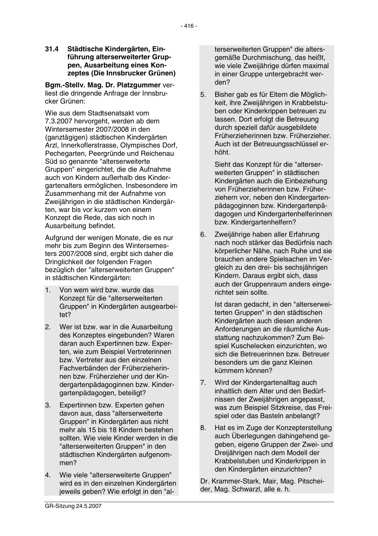 Bgm.-Stellv. Mag. Dr. Platzgummer verliest die dringende Anfrage der Innsbrucker Grünen: