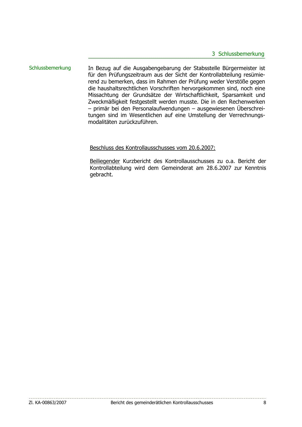 Kontrollabteilung wird dem Gemeinderat am 28.6.2007 zur Kenntnis