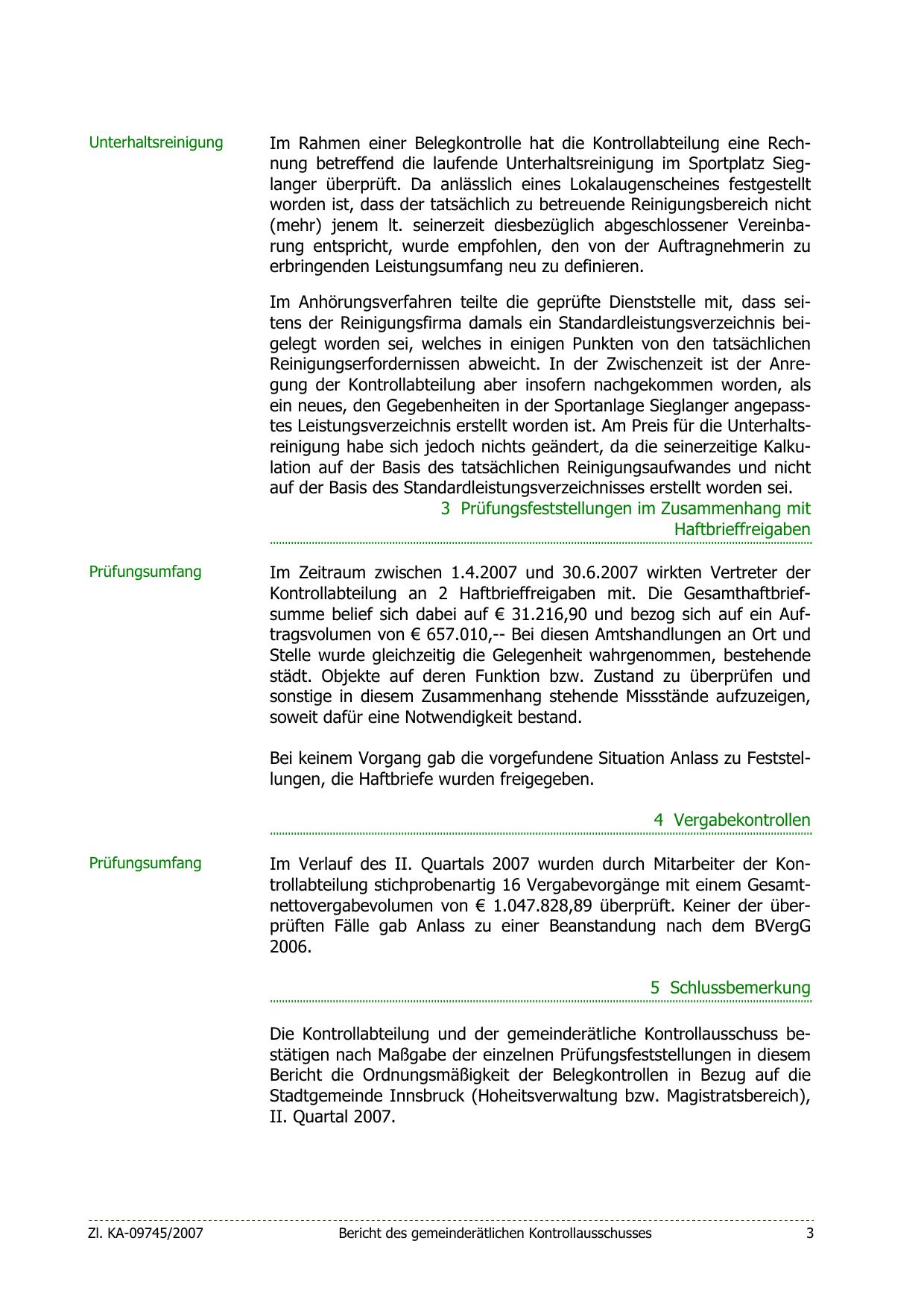 Im Verlauf des II. Quartals 2007 wurden durch Mitarbeiter der Kontrollabteilung stichprobenartig 16 Vergabevorgänge mit einem Gesamtnettovergabevolumen von € 1.047.828,89 überprüft. Keiner der überprüften Fälle gab Anlass zu einer Beanstandung nach dem BVergG