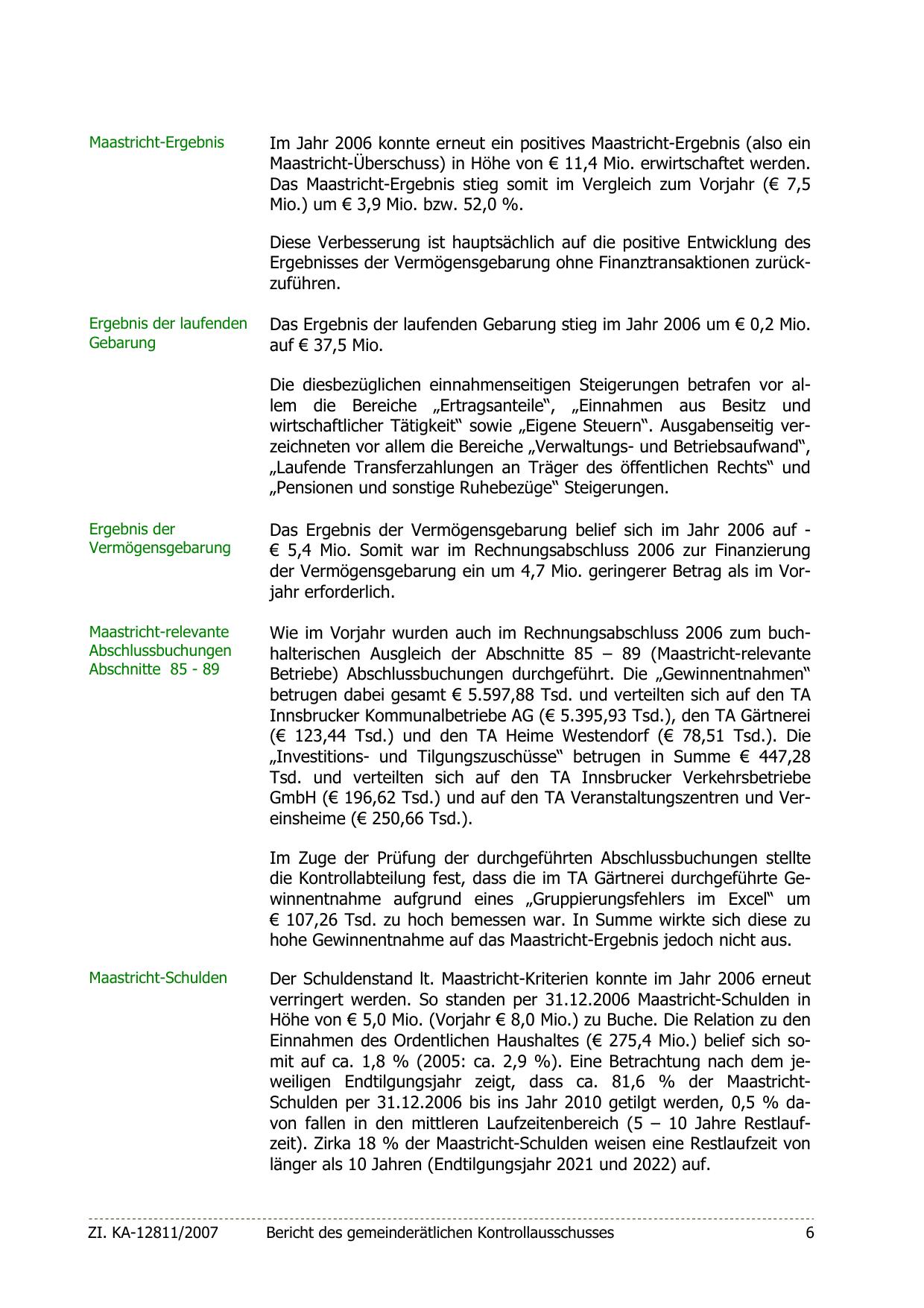 Einnahmen des Ordentlichen Haushaltes (€ 275,4 Mio.) belief sich somit auf ca. 1,8 % (2005: ca. 2,9 %). Eine Betrachtung nach dem jeweiligen Endtilgungsjahr zeigt, dass ca. 81,6 % der MaastrichtSchulden per 31.12.2006 bis ins Jahr 2010 getilgt werden, 0,5 % davon fallen in den mittleren Laufzeitenbereich (5 – 10 Jahre Restlaufzeit). Zirka 18 % der Maastricht-Schulden weisen eine Restlaufzeit von