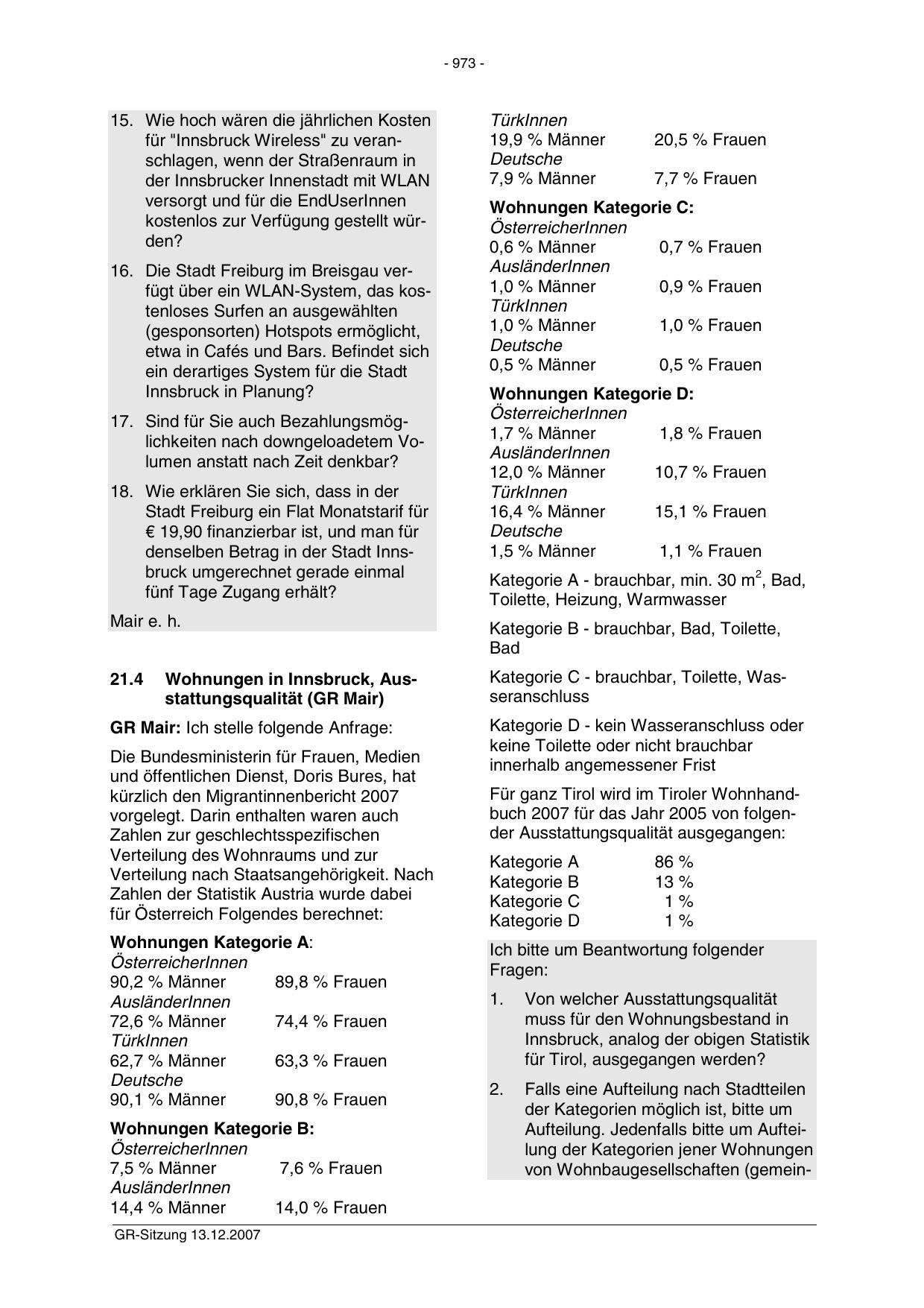 Wohnungen in Innsbruck, Ausstattungsqualität (GR Mair)