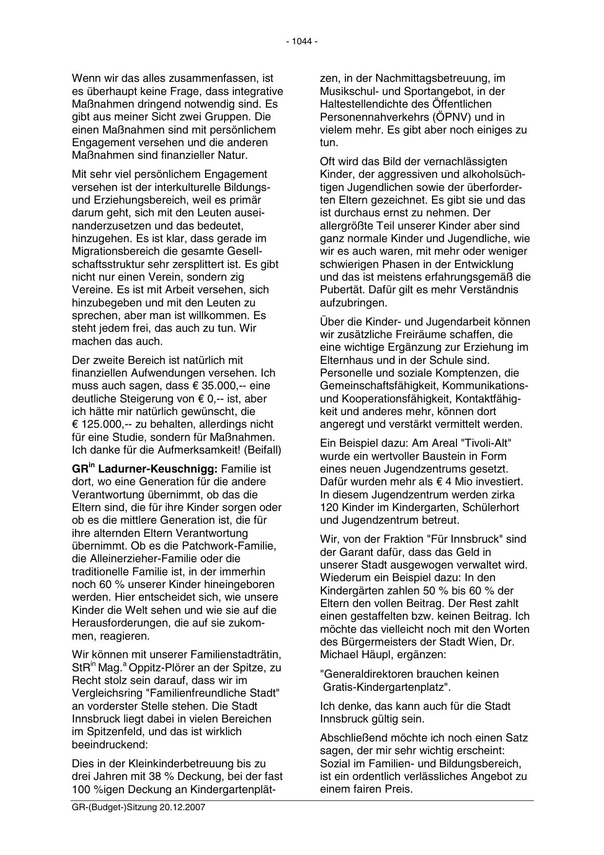 100 %igen Deckung an KindergartenplätGR-(Budget-)Sitzung 20.12.2007